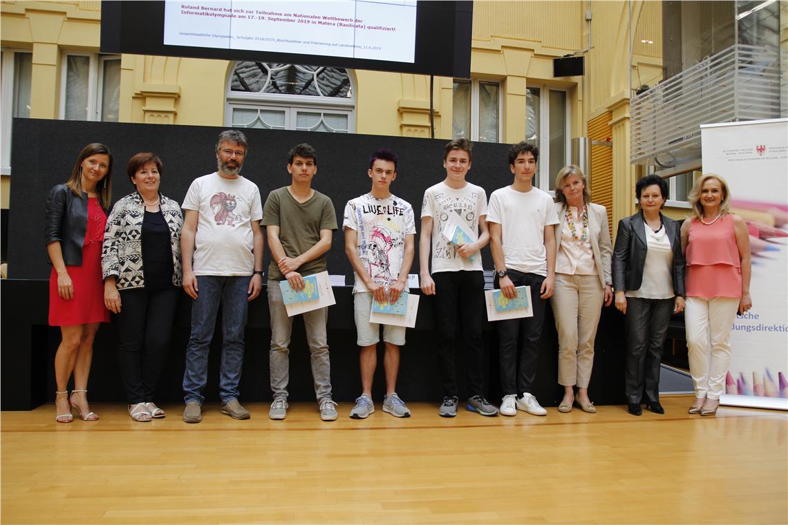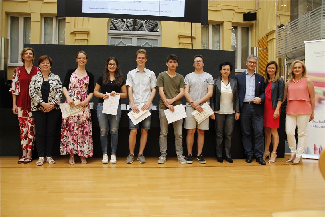 Bei der Prämierungsfeier im Innenhof des Palais Widmann in Bozen wurden Schülerinnen und Schüler der deutschsprachigen Oberschulen ausgezeichnet, die in diesem Schuljahr an den gesamtstaatlichen Mathematik-, Informatik-, Physik- und Chemie-Olympiaden teilgenommen und dabei die jeweils besten Ergebnisse erzielt haben. Die Teilnehmenden haben sich auf mehreren Ebenen qualifiziert, ausgehend von den Wettbewerben auf Schulebene über die Qualifikationswettbewerbe auf Landes- und Regionalebene bis zur nationalen Ebene. Melanie Kiem vom Realgymnasium Albert Einstein Meran wird im Juli sogar noch an der internationalen Chemie-Olympiade in Paris teilnehmen.