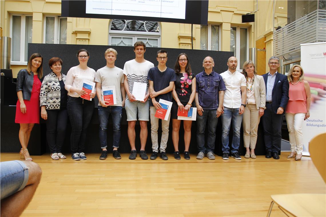 "Es geht bei diesen Wettbewerben nicht nur darum, zu gewinnen. Es geht um die fachliche Weiterentwicklung der Olympioniken wie auch um die Stärkung ihrer Persönlichkeit", unterstrich heute (11. Juni) die Koordinatorin des Arbeitsbereiches Begabten- und Begabungsförderung an der Pädagogischen Abteilung der Deutschen Bildungsdirektion, Siglinde Doblander. Das sei auch dieses Jahr wieder sehr gut gelungen, freute sich Doblander. Einige Teilnehmerinnen und Teilnehmer erzielten Spitzenergebnisse (List der fünf Bestklassifizierten aller Kategorien der gesamtstaatlichen Mathematik-, Informatik-, Physik- und Chemie-Olympiaden im Anhang). Doblander dankte allen Schulführungskräften und den Lehrpersonen, die durch guten Unterricht die Basis zur Teilnahme an den Wettbewerben legen und durch die eigene Begeisterung Schülerinnen und Schüler motivieren.