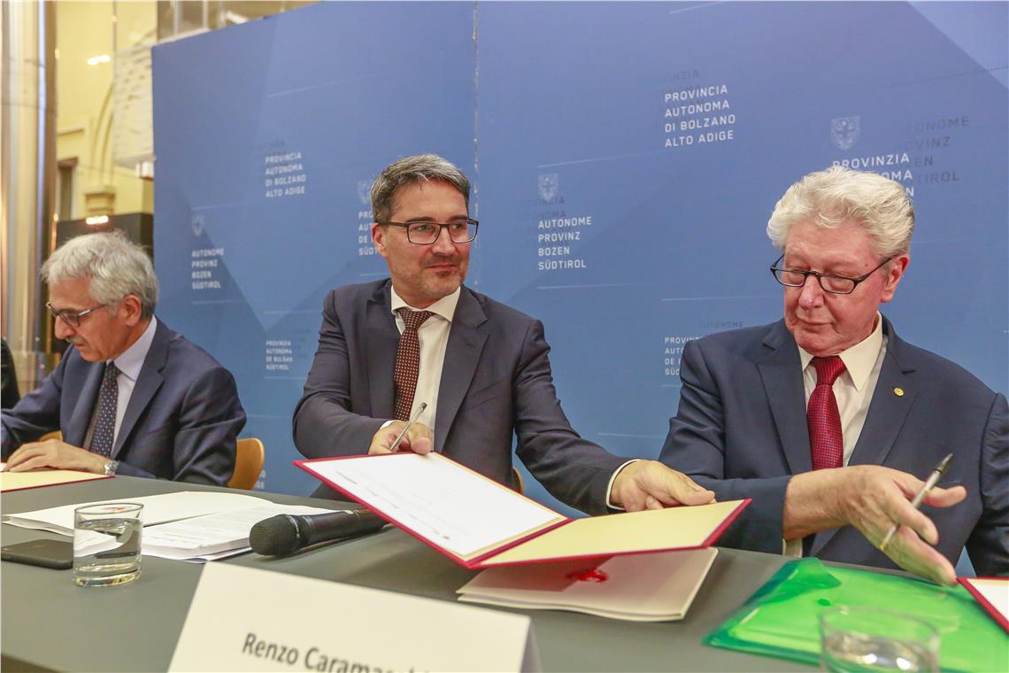 Die heutige (3. Juli) Unterzeichnung des Programmabkommens für das Bahnhofsareal stellt für die städtebauliche Entwicklung der Landeshauptstadt Bozen den Startpunkt für eine neue Phase dar. Vorausgegangen war eine jahrelange Vorbereitungszeit, in der zahlreiche Verhandlungen und Treffen stattgefunden sowie Studien und Projekte erstellt wurden. Die Unterschriften von Landeshauptmann Arno Kompatscher, des Bozner Bürgermeisters Renzo Caramaschi, der Vizepräsidentin von ARBO Areal Bozen – ABZ AG Silvana Giancane sowie der Vertreter der Eisenbahngesellschaft Maurizio Gentile (Generaldirektor RFI), Umberto Lebruto (Sistemi Urbani) und Roger Hopfinger (Regionaldirektor Trenitalia) sind die Basis für die nächsten Schritte.