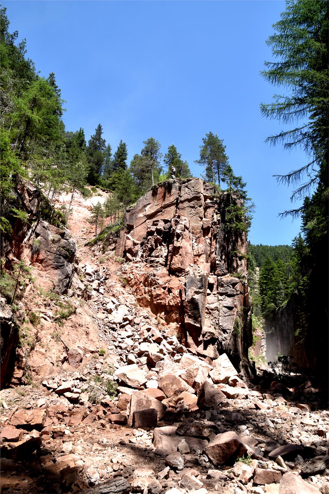 Bei seiner Stippvisite konnte Bessone auch die Ergebnisse eines Eingriffs zur Sicherung eines Porphyrkamms im Bletterbach-Canyon begutachten, den die Geologen des Landesamts für Geologie und Baustoffprüfung Ende Juni vorgenommen haben. Die Landesgeologen überprüfen regelmäßig die Sicherheit im Canyon. Bereits im Mai 2018 waren auf dem Kamm, der offensichtlich Risse aufwies, Dehnungsmessstreifen angebracht worden, ebenso wie spezielle Geräte zur Überwachung der Gesteinsbewegungen. Heuer im Mai und Juni hatten die Geräte eine exponentielle Beschleunigung der Verschiebung gezeigt. Durch den vom Landesamt für Geologie und Baustoffprüfung beauftragten und vom Unternehmen Locher vorgenommenen Eingriff unter Leitung des Geologen Giacomo Nardin wurden etwa 200 Kubikmeter abbruchgefährdetes Gestein abgetragen. Auf diese Weise wurde eine eindrucksvoller Teil des Canyons für die Besucher gesichert und zugänglich gemacht. In die Arbeiten waren auch die Geoparc-Mitarbeiter und Mitarbeitern der Landesabteilung Forstwirtschaft involviert.