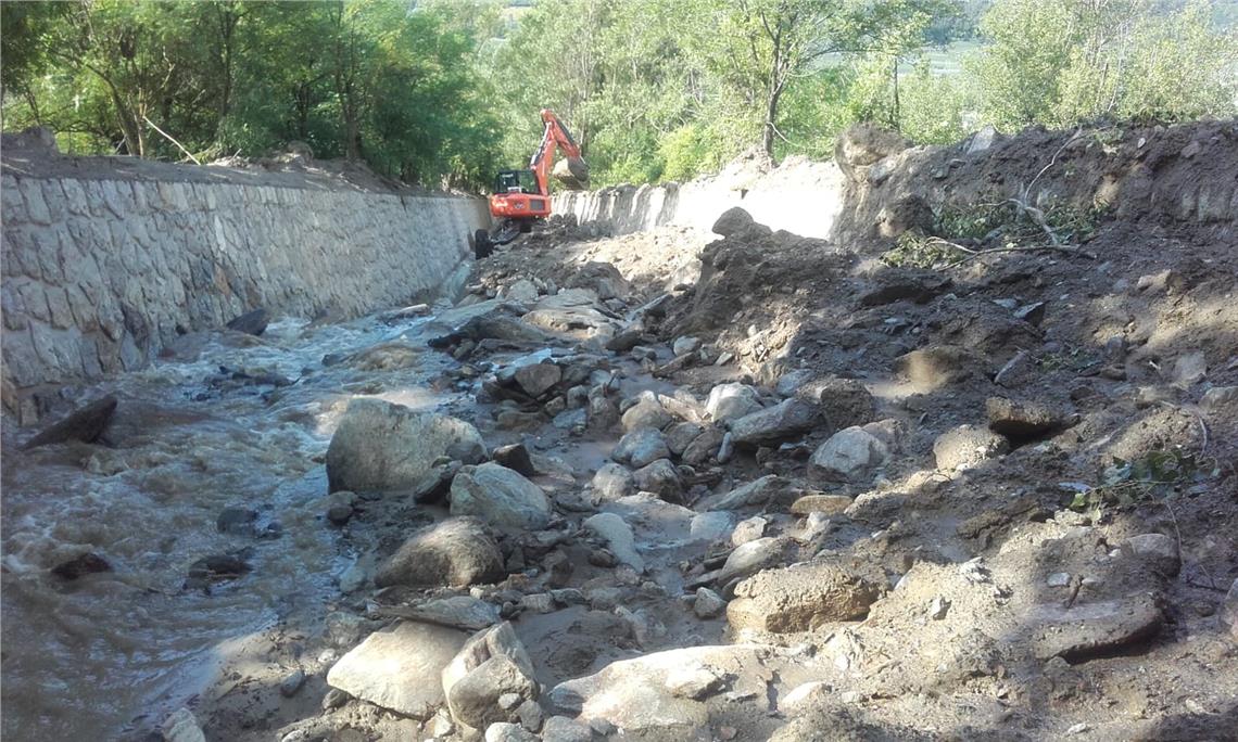 Am Donnerstag war um circa 21.30 Uhr ein Mure am Vezzanerbach abgegangen, mit der sich rund 7000 Kubikmeter Material entlang der Künette und im Rückhaltebecken ablagerten. Vom Mündungsbereich ausgehend wurde am Freitag und Samstag die Künette in einem halben Kilometer langen Abschnitt geräumt. Derzeit werden die Aufräumarbeiten fortgeführt. Auf Goldrainer Seite gelangte die Mure bis zum Schießstand, auf Vetzaner Seite kam die Mure 30 Meter oberhalb des Sportplatzes zum Stillstand.