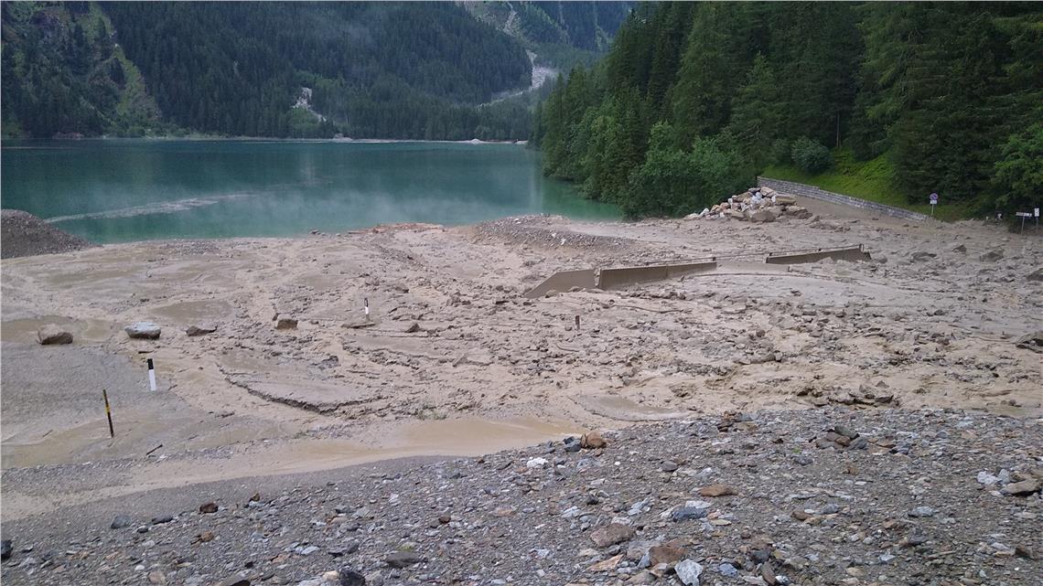 An die 15.000 Kubikmeter Material konnten von der bestehenden Rückhaltesperre zurückgehalten werden, erklärt Peter Egger, Direktor des Amtes für Wildbach- und Lawinenverbauung Süd. Der Rest hat sich im darunterliegenden Wald und auf viereinhalb Hektar umliegenden Wiesen und Felder abgelagert.