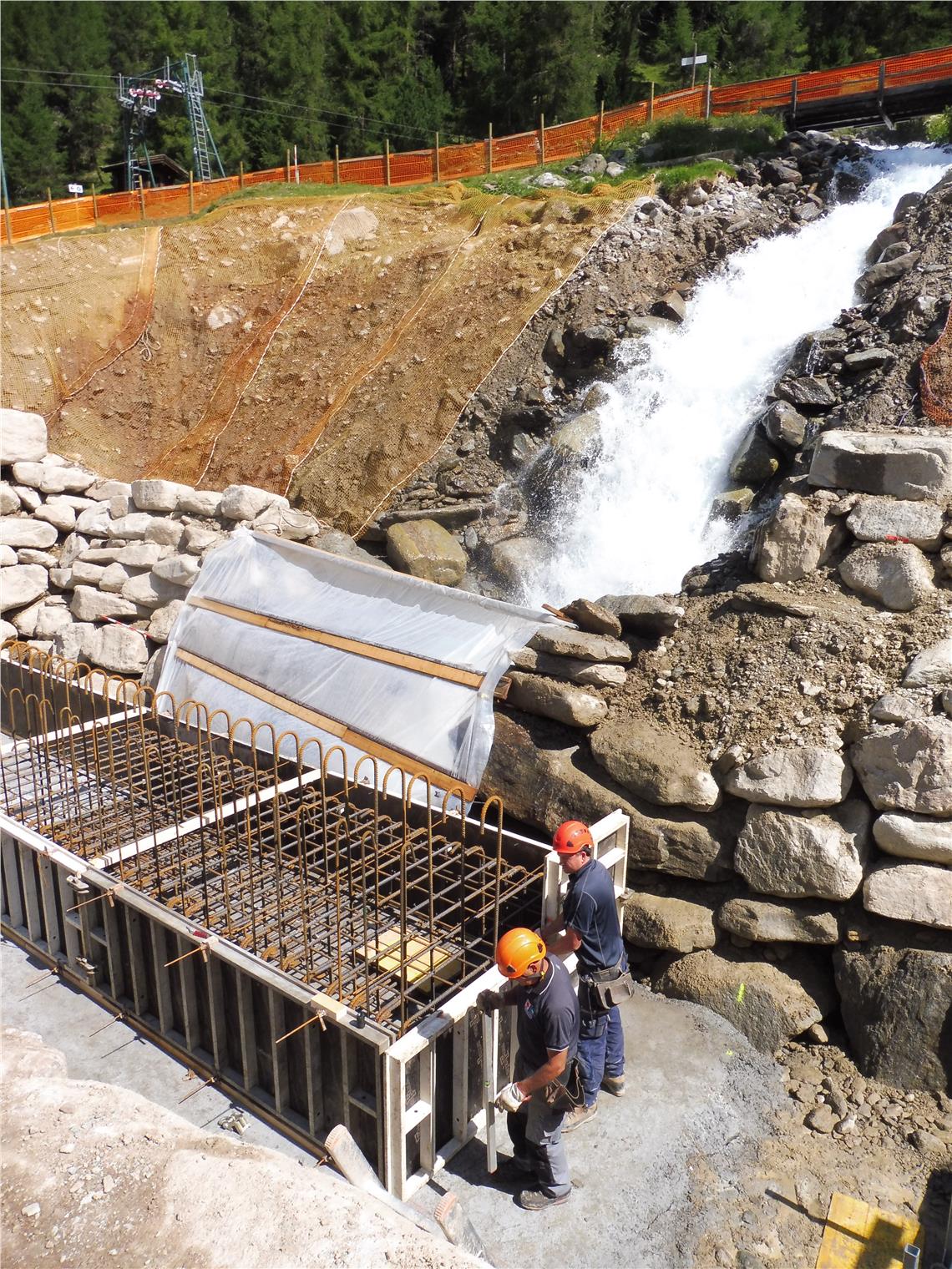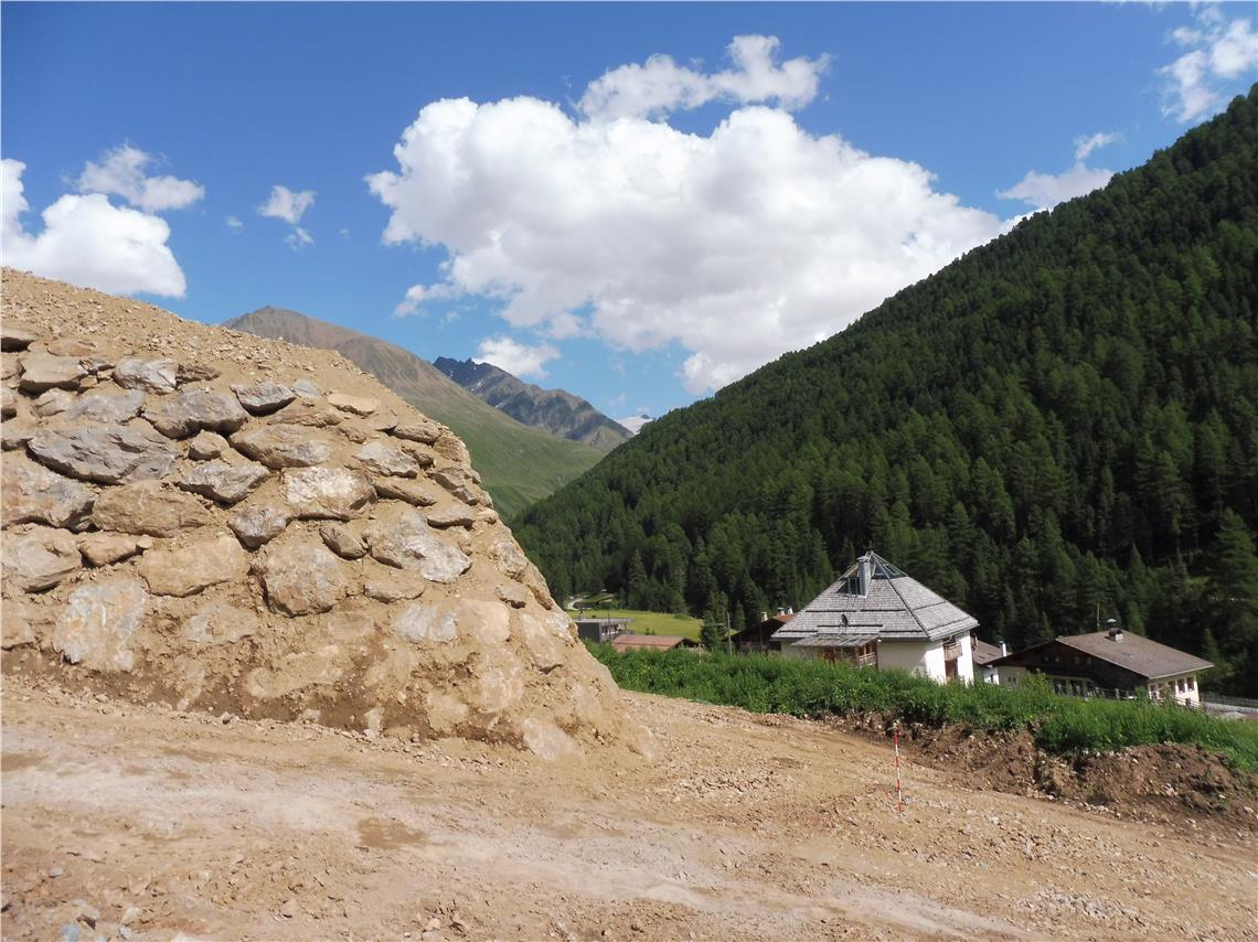Im vergangenen Herbst wurde unter der Bauleitung von Julius Staffler mit der Verlegung von Trinkwasser-, Beregnungs- und Stromleitungen sowie der Glasfaserinfrastruktur begonnen. Im heurigen Frühjahr nahmen Vorarbeiter Florian Hofer und seine Mannschaft die Arbeiten nach der Schneeschmelze wieder auf. Derzeit wird an einem 200 Meter langen und acht Meter hohen Ablenkdamm gebaut, der lawinenseitig als Zyklopenmauer ausgeführt wird. Danach wird die Böschung talseitig begrünt.