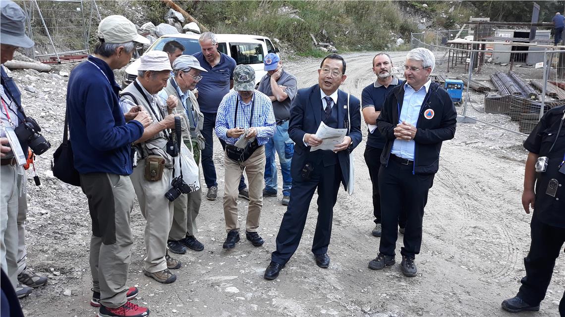 Mit Sandro Gius, Direktor des Landesamtes für Wildbach- und Lawinenverbauung Ost der Agentur für Bevölkerungsschutz, und dem Landesgeologen Volkmar Mair besichtigte die Gruppe die Sperrenstaffelung bei Hahnebaum in der Gemeinde Moos in Passeier. Vor der Besichtigung der Baustelle verschaffte Agenturdirektor Rudolf Pollinger den Mitgliedern des japanischen Vereins einen Überblick über das Land Südtirol und die Agentur für Bevölkerungsschutz. Im Anschluss erklärte Volkmar Mair die Geologie des Gebietes mit seiner historischen Rutschung. Bei der Besichtigung dabei war der Mooser Bürgermeisters Gothard Gufler.
