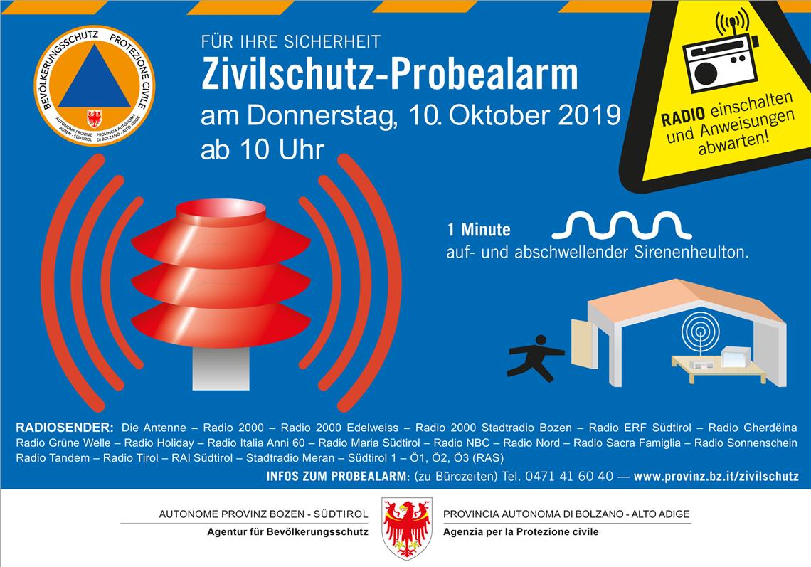 Eben dieses einheitliche Zivilschutzsignal mit seinem auf- und abschwellenden Heulton wird am Donnerstag kommender Woche, dem 10. Oktober, nach 10 Uhr landesweit über alle rund 550 Sirenen in den neun Feuerwehrbezirken in Südtirol zu hören sein. Dieser Probealarm, unterstreicht der Direktor der Agentur für Bevölkerungsschutz Rudolf Pollinger, dient neben dem Aufdecken von eventuellen technischen Mängeln vor allem der Bewusstseinsbildung, er soll die Bevölkerung mit dem Zivilschutzsignal vertraut machen und damit verbunden mit dem Verhalten, das nach dem Ertönen des Zivilschutzalarms erfolgen soll: Im Falle eines Zivilschutzalarms sollte möglichst schnell ein Gebäude aufgesucht werden, Fenster und Türen sollen geschlossen, Lüftungen ausgeschaltet werden. Anschließend sollen Radio oder Fernseher eingeschaltet werden, da dort das Bevölkerungsinformationssystem auf Sendung geht. Auch im Bürgernetz wird informiert. Die Laufschrift - diesmal mit dem Hinweis, dass es sich um einen Probealarm handelt - wird auch in den über die Rundfunkanstalt Südtirol RAS ausgestrahlten ausländischen Fernsehsendern zu sehen sein.