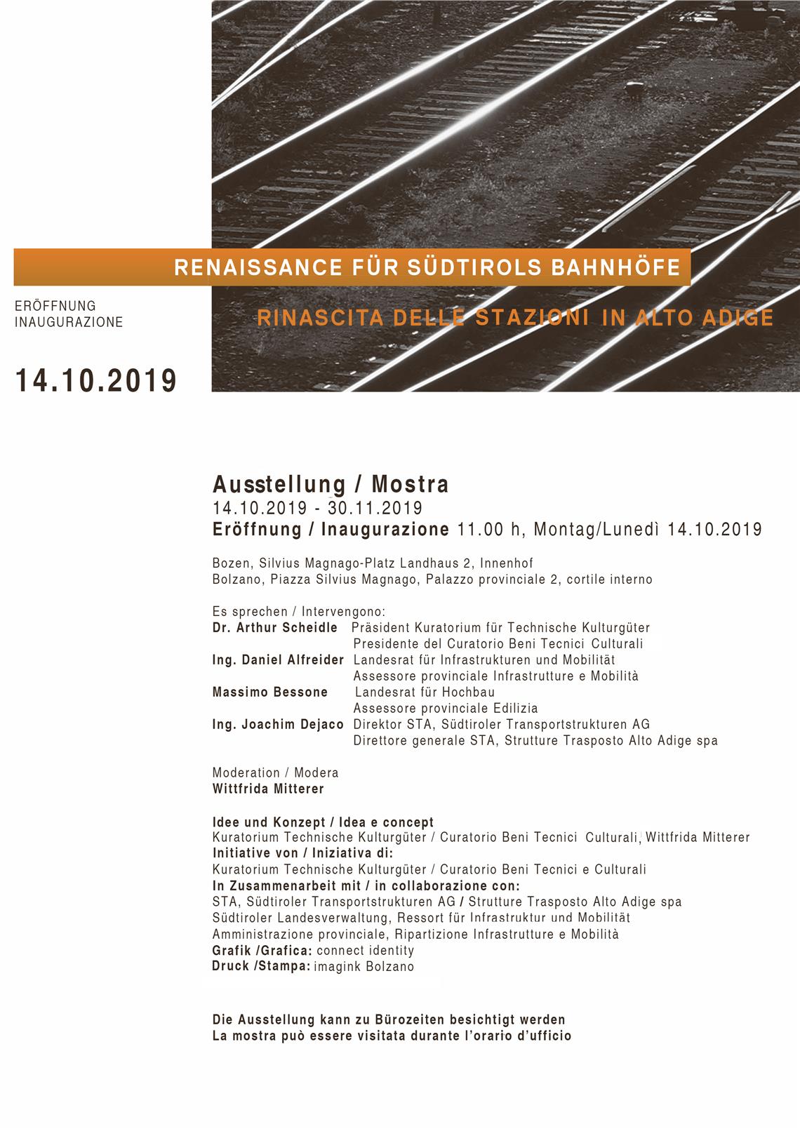 Renaissance für Südtirols Bahnhöfe: Unter diesem Titel präsentiert das Kuratorium Technische Kulturgüter in Zusammenarbeit mit der Südtiroler Landesverwaltung und der Südtiroler Transportstrukturen AG STA eine Ausstellung über die Bahnhofsinstandsetzungen der vergangenen 15 Jahre in Südtirol.