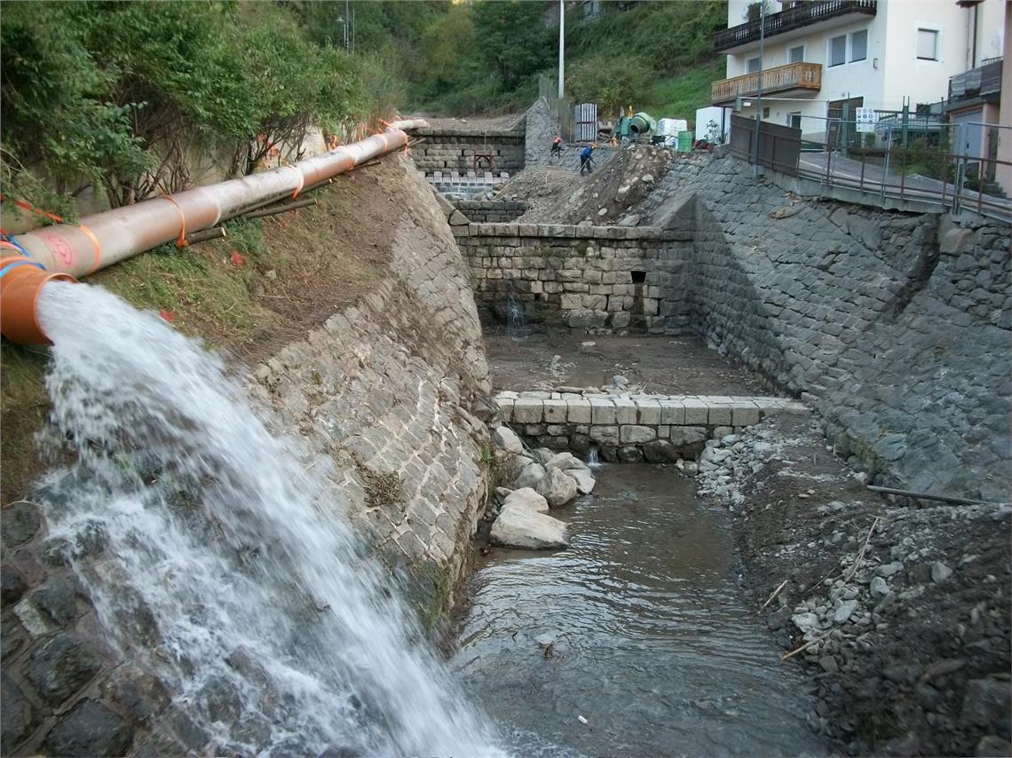 Nach einem Projekt und unter der Bauleitung von Andreas Vettori vom Landesamt für Wildbach- und Lawinenverbauung Nord in der Agentur für Bevölkerungsschutz sanieren die Arbeiter mit Vorarbeiter Hubert Rungger die bestehenden Querwerke und die Ufermauern im Gonderbach, der durch Kollmann fließt. Nach der Reinigung der Mauern kommen jetzt die Querwerke zum Vorschein. "Damit", erläutert Bauleiter Vettori, "wird das Schadensausmaß erst sichtbar." Die Schäden sind Abnutzungserscheinungen und werden deshalb mittels Instandhaltungsprojekt und nicht über ein Bauprojekt beseitigt.