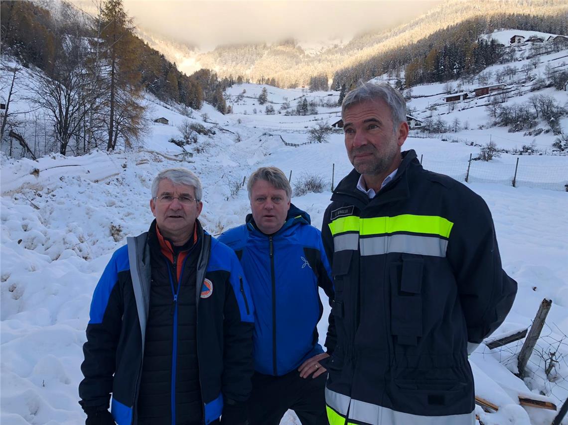 Nach dem Lawinenabgang im Martelltal ist die Wildbachverbauung bereits mit den Aufräumarbeiten beschäftigt. Landesrat Arnold Schuler und der Direktor der Agentur Rudolf Pollinger haben sich heute Vormittag gemeinsam mit Bürgermeister Georg Altstätter einen Überblick über die aktuelle Lage vor Ort verschafft.