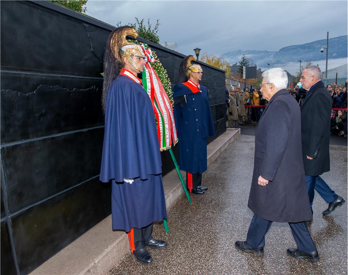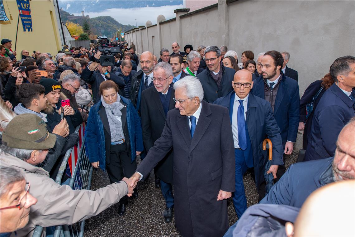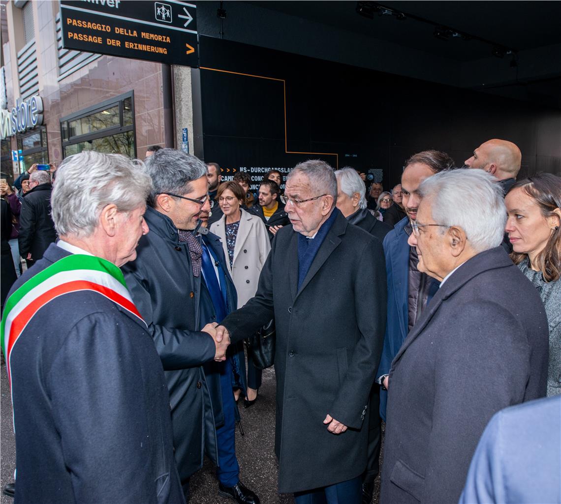Die Staatsoberhäupter von Italien und Österreich, Sergio Mattarella und Alexander Van der Bellen, haben heute (23. November) Nachmittag gemeinsam mit ihrem Gastgeber, Landeshauptmann Arno Kompatscher, in Bozen an zwei symbolischen Orten der Opfer des Faschismus und Nationalsozialismus gedacht: Gemeinsam mit dem Bürgermeister der Gemeinde Bozen Renzo Caramaschi begaben sie sich zunächst zum Ansitz Stillendorf, wo der Marlinger Lehrer Franz Innnerhofer zum ersten Südtiroler Opfer des Faschismus geworden war. Anschließend hielten sie an der neu gestalteten Gedenkmauer des ehemaligen nationalsozialistischen Durchgangslagers inne.