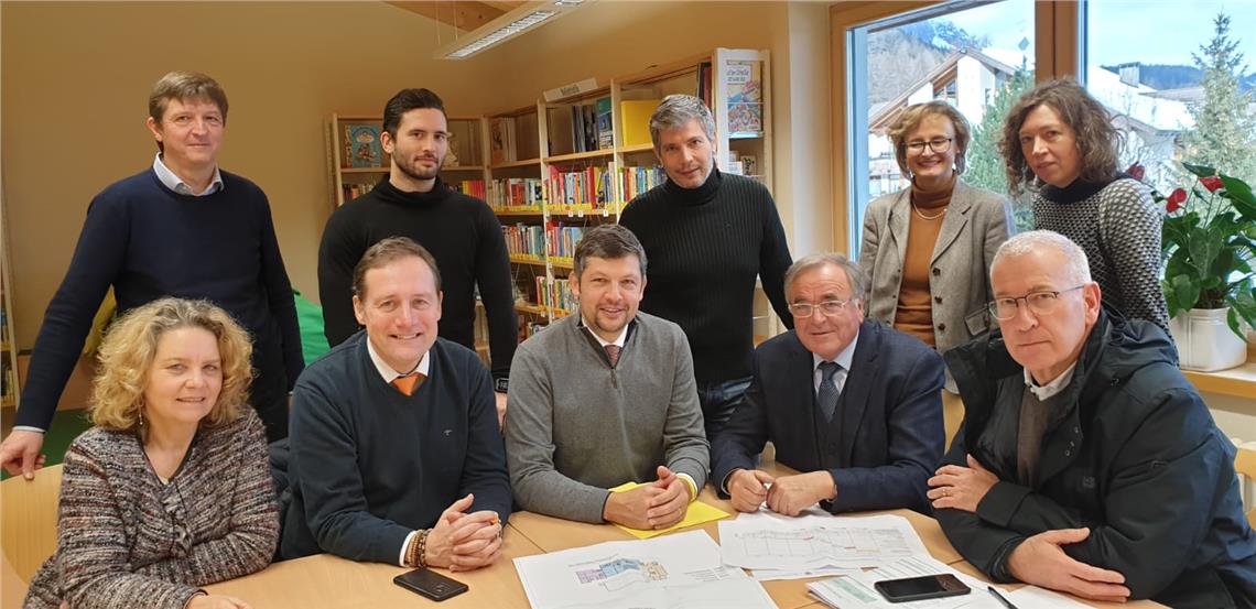 Das Schulzentrum in Stern im Gadertal soll umfassend umgebaut werden. Um sich ein Bild des bevorstehenden Eingriffs zu verschaffen, waren die LR Bessone und Alfreider kürzlich vor Ort.