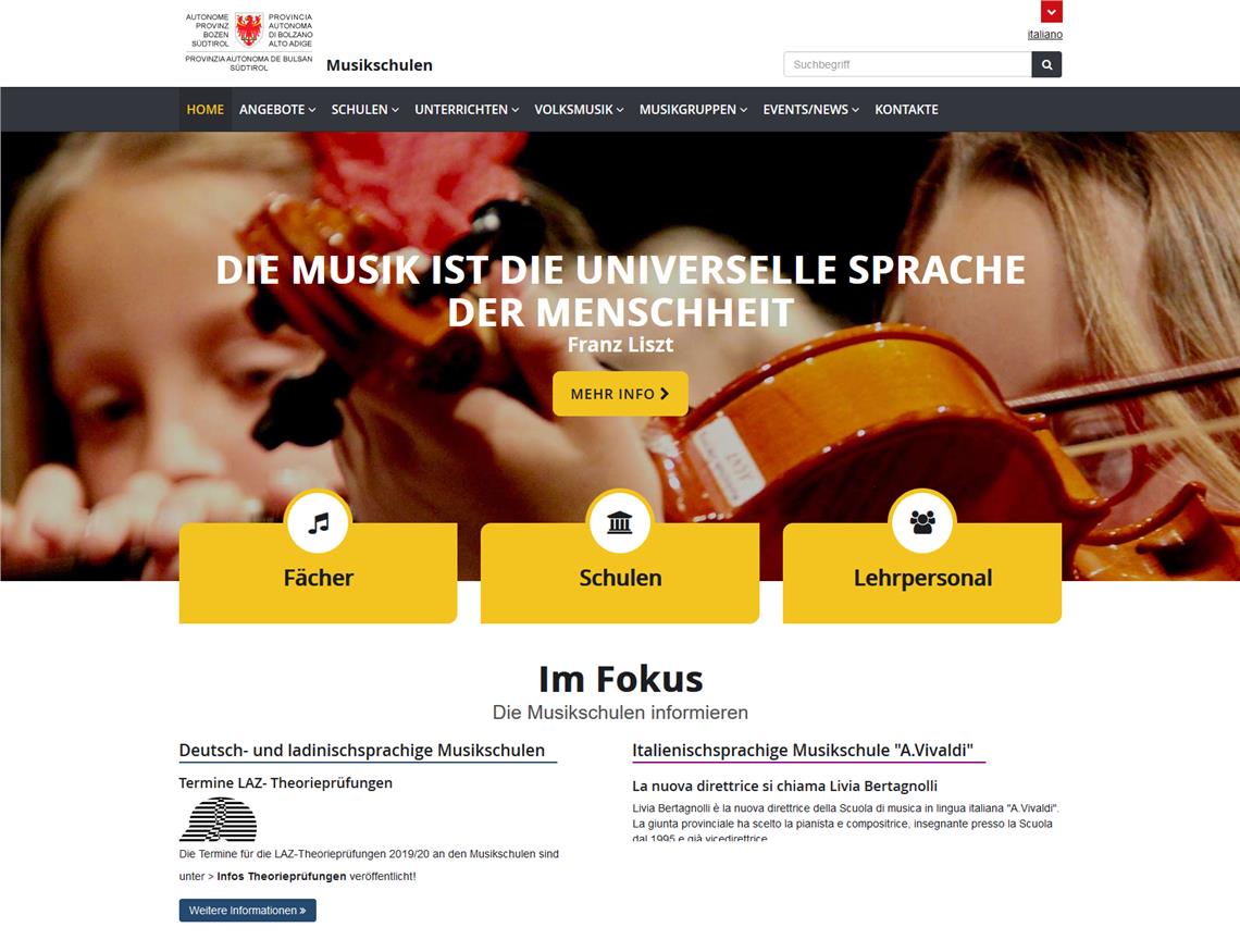 Im neuen Webportal stellen sich alle 17 deutsch- und ladinischsprachigen Musikschulen sowie die italienischsprachige Musikschule "A. Vivaldi" vor. Besucher der Seite finden eine vollständige Übersicht aller Instrumente und Fächer mit den jeweiligen Lehrschulen und Lehrpersonen der organisatorisch voneinander getrennten Musikschuldirektionen. Es gibt auch einen eigenen Bereich zur Volksmusik. Das neue Webportal der Musikschulen ist Teil des Internetauftritts der Südtiroler Landesverwaltung.