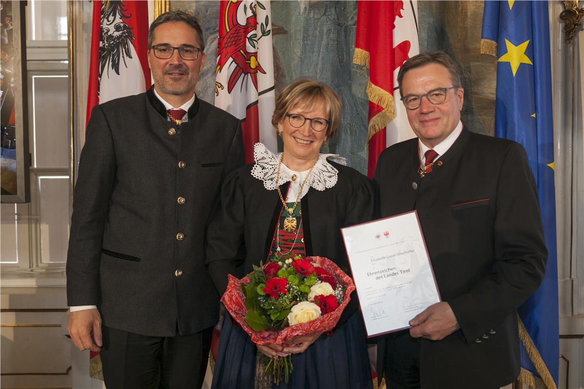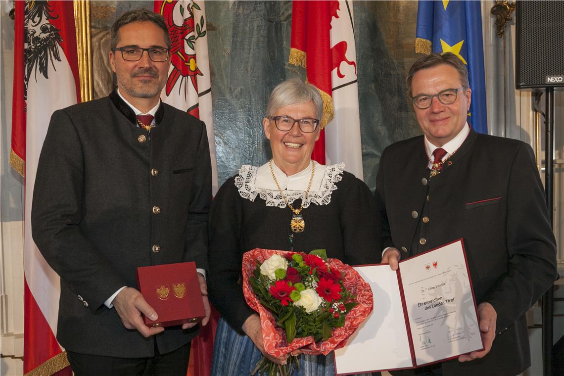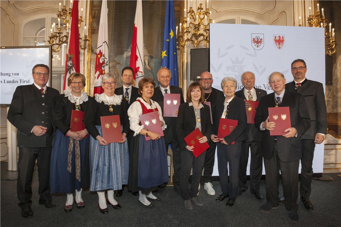 Neben den drei Südtirolern haben heute drei Frauen und vier Männer aus Tirol das Ehrenzeichen des Landes Tirol erhalten. Es sind dies: Helmut Bodner (Verdienste des Bauunternehmers aus Kufstein um den Wirtschaftsstandort und das Sozialwesen in Tirol), Gerhard Friedle (Verdienste des Popstars „DJ Ötzi“ als internationaler Botschafter für Tirol), Evelyn Haim-Swarovski (Verdienste der Grande Dame des Dressurreitens vom Schindlhof in Fritzens um die Tiroler Wirtschaft und den Pferdesport in Österreich), Univ.-Prof. Barbara Juen (Verdienste der Mitbegründerin des Kriseninterventionsteams Tirol und fachlichen Leiterin der Psychosozialen Dienste des Österreichischen Roten Kreuzes), Wilfried Stauder (Verdienste des Aufsichtsratsvorsitzenden der Hypo Tirol Bank um den Wirtschaftsstandort Tirol), Leopold Wedl (Verdienste um den Wirtschaftsstandort Tirol durch den Aufbau des Handelshauses Wedl) sowie Prof. Hildegard Wittlinger (Verdienste als Wegbereiterin der manuellen Lymphdrainage vom Therapiezentrum Walchsee).