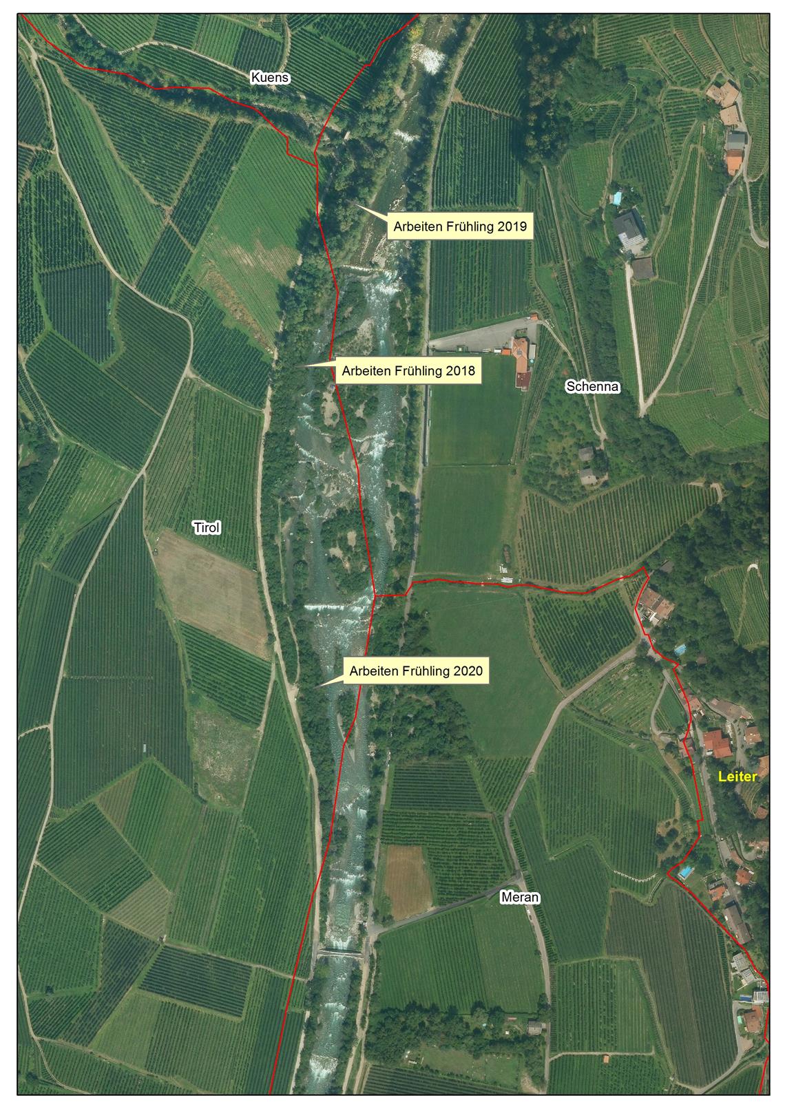 Diese Arbeiten, erläutert der Direktor der Agentur für Bevölkerungsschutz Rudolf Pollinger, werden nun talwärts Richtung Meran fortgeführt mit dem Ziel, den Hochwasserschutz für Meran zu erhalten, die gewässerökologische Situation zu verbessern und eine weitere Naherholungszone zu schaffen. Vor Ort werden die Arbeiten von Baustellenleiterin Lea Gasser betreut und von Bauleiter Peter Egger koordiniert, der die Amtsdirektion der Zone West mit Anfang dieses Jahres neu übernommen hat.
