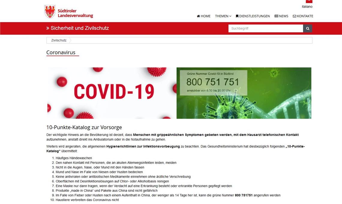 Informationen können auch der eigens eingerichteten, laufend aktualisierten Homepage www.provinz.bz.it/coronavirus entnommen werden, dort sind Verordnungen, Antworten auf häufig gestellte Fragen und Richtlinien zur Vorsorge zu finden.