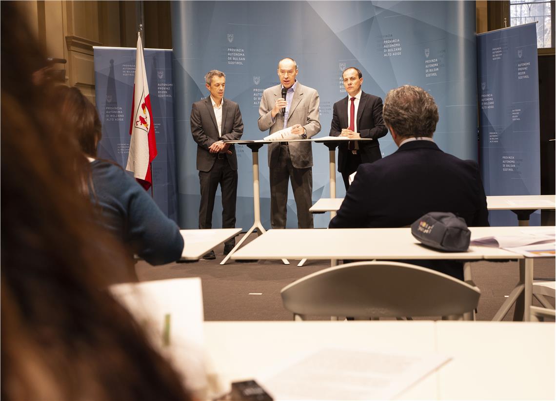 Eine erste Bilanz über die Mess-Daten zur Luftqualität im vergangenen Jahr präsentierten heute (2. März) Umweltlandesrat Giuliano Vettorato, der Direktor der Labors für Luftanalysen und Strahlenschutz Luca Verdi und der Direktor des Landesamtes für Luft und Lärm Georg Pichler im Rahmen einer Pressekonferenz im Palais Widmann in Bozen.
