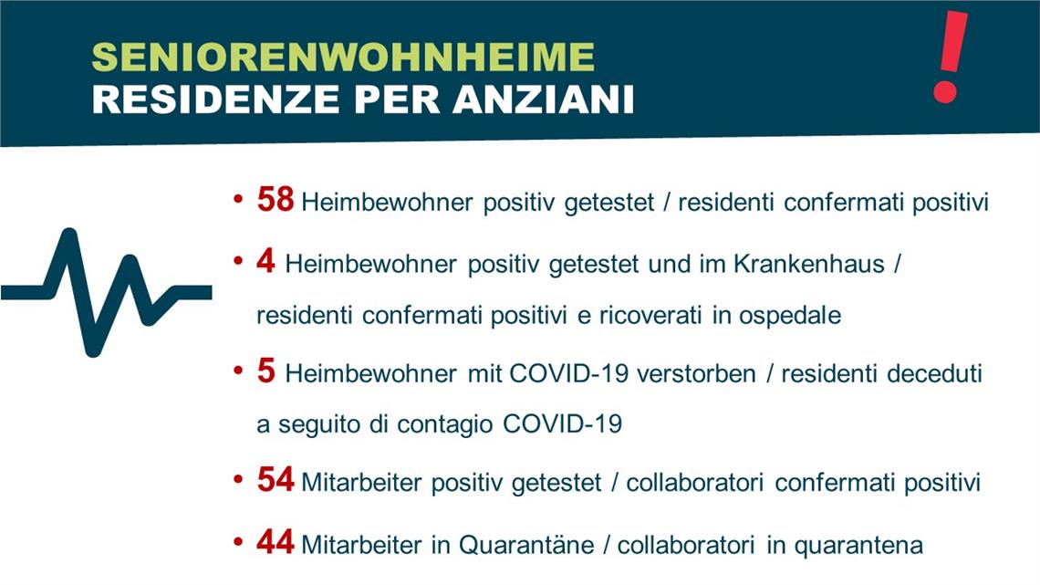 Insgesamt gibt es in Südtirol 76 Seniorenwohnheime, in denen 4300 Seniorinnen und Senioren wohnen, leben und versorgt werden. Laut aktuellem Stand wurden insgesamt 58 Heimbewohner positiv auf das Coronavirus getestet, fünf Bewohner unterschiedlicher Heime sind mit dem Coronavirus gestorben, vier werden in einem Krankenhaus medizinisch versorgt, 278 Heimbewohner sind aus Sicherheitsgründen im Heim in Quarantäne. Bei den Mitarbeitern wurden bisher insgesamt 54 positiv auf das Coronavirus getestet, 44 Mitarbeiterinnen und Mitarbeiter befinden sich momentan in Quarantäne. "Diese Situation ist eine sehr dynamische, die tagtäglich Veränderungen erfahren kann", erklärte Brigitte Waldner, Direktorin des Amtes für Senioren und Sozialsprengel. Wichtige Koordinierungs- und Unterstützungsarbeit für die Seniorenwohnheime leiste momentan auch ein Krisenstab, in dem Vertreter des Landesamtes, des Verbandes der Seniorenwohnheime, des Bevölkerungsschutzes, des Sanitätsbetriebes und mit Direktoren, Präsidenten und Pflegedienstleitern der Seniorenwohnheime zusammenarbeite. Die Lage sei ernst, doch werde mit dieser Situation werde bestmöglich umgegangen, auch dank der großartigen Leistung des Personals an allen Stellen, hob Amtsdirektorin Waldner hervor.