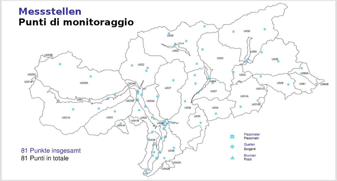 Der quantitative Zustand des Grundwassers bezeichnet die menschliche Einwirkung auf die Menge der unterirdischen Wasserressourcen. Besonders gefährdet sind die Grundwasserkörper, von denen auf längere Zeit mehr Wasser entnommen wird, als von den natürlichen Quellen nachgespeist wird. Aus den Daten der laufenden Nutzungsperiode zeigt sich an allen Messpunkten ein guter quantitativer Zustand. Die Wasserkörper der Talsohle sind im Gleichgewicht und der Wasserstand der Piezometer der verschiedenen Talboden-Wasserkörper spiegelt die Niederschläge wieder. Der Grundwasserleiter von Bozen wird durch die Wasserführung und Speisung des Eisacks entscheidend beeinflusst.