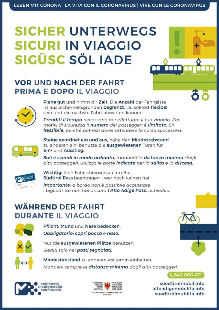 Vorerst werden die Stadtbusse und mit einigen wenigen Ausnahmen auch die Überlandbusse in ganz Südtirol sowie die Rittner Seilbahn wieder laut Werktagsfahrplan fahren. Auch die Potenzierung der Bahndienste in Südtirol ist in Vorbereitung. Die italienische Eisenbahngesellschaft Trenitalia hat mitgeteilt, dass sie ab dem 4. Mai wieder 60 Prozent der Kapazität des normalen Diensts anbieten wird und ab den 18. Mai dann wieder fast den gesamten Normalbetrieb wie vor dem Notstand garantiert.