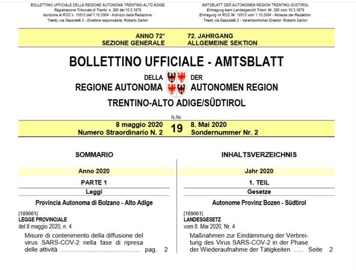 Das Landesgesetz Nr. 4 vom 08.05.2020 "Maßnahmen zur Eindämmung der Verbreitung des Virus SARS-COV-2 in der Phase der Wiederaufnahme der Tätigkeiten", das von der Landesregierung vorgelegt wurde und das der Südtiroler Landtag vergangene Nacht genehmigt hat, wurde nach der Ausfertigung durch Landeshauptmann Arno Kompatscher kurz nach 14 Uhr im Amtsblatt der Region veröffentlicht.