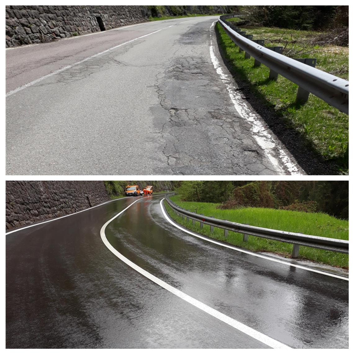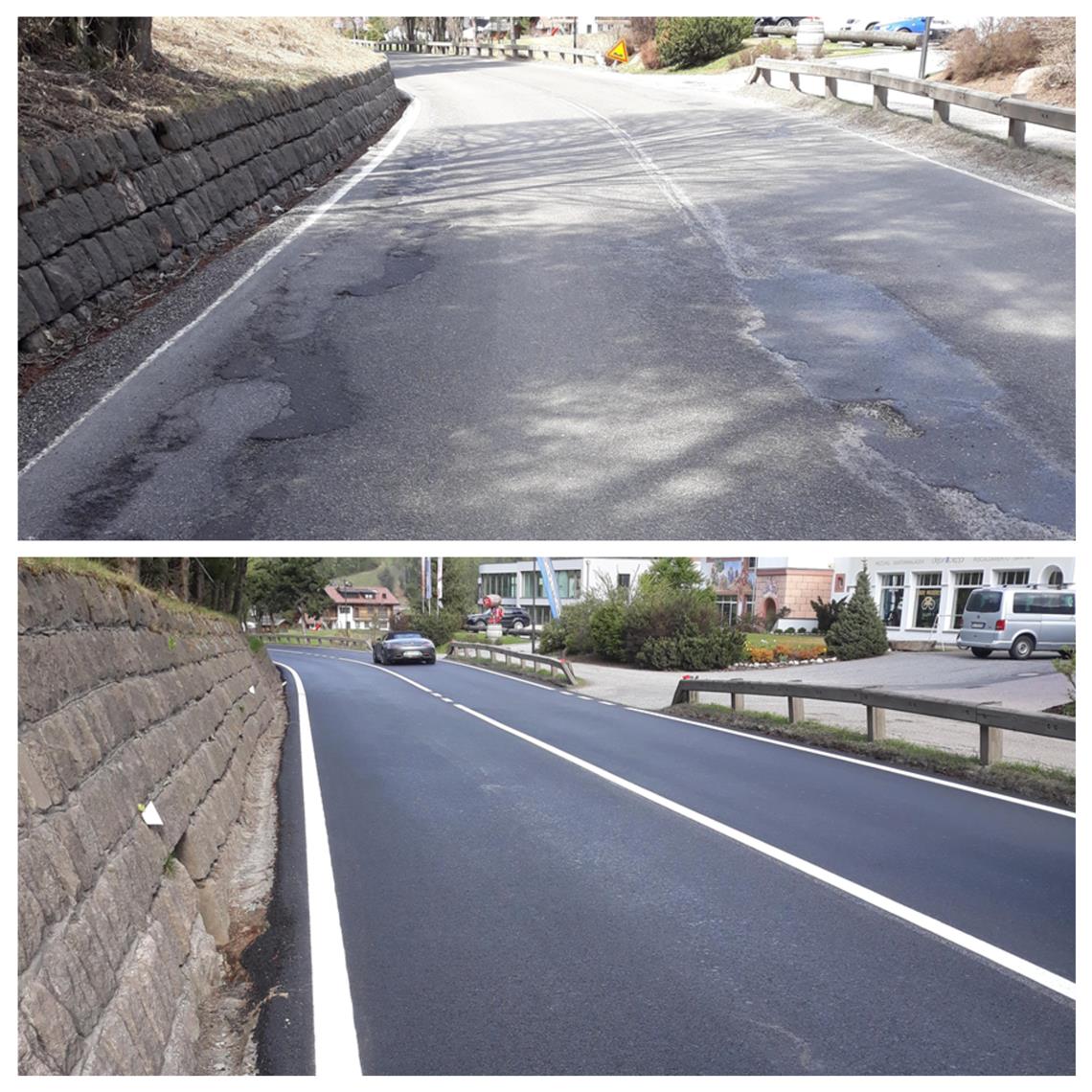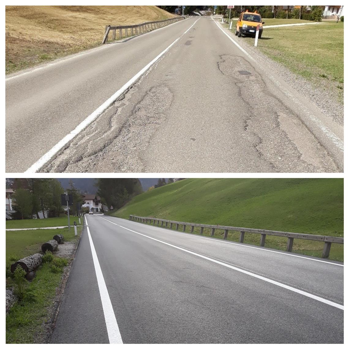 An gleich mehreren Stellen hat der Straßendienst des Landes auf den Staatsstraße von Waibruck nach St. Ulrich neuen Asphalt aufgetragen. Auch Instandhaltungsarbeiten wurden gemacht.