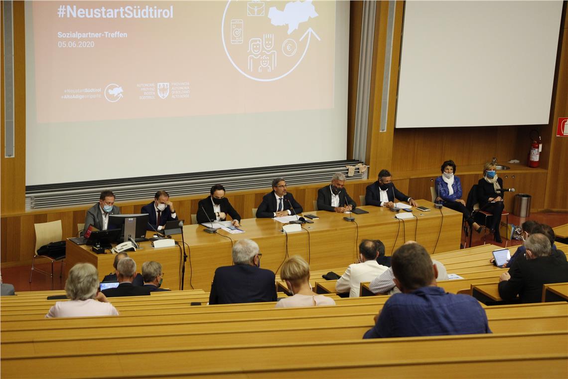 Wirtschaft und Sozialwesen, Jung und Alt, Männer und Frauen - alle sollten in dieser Corona-Phase 2 zusammenhalten, um den Neustart voranzutreiben und eine zweite Infektionswelle zu vermeiden oder möglichst klein zu halten, da es einen zweiten Lockdown nicht geben dürfe. Dies forderte Soziallandesrätin Waltraud Deeg bei dem heutigen (5. Juni) Treffen der Landesregierung mit den Sozialpartnern in der Aula Magna der Universität Bozen.