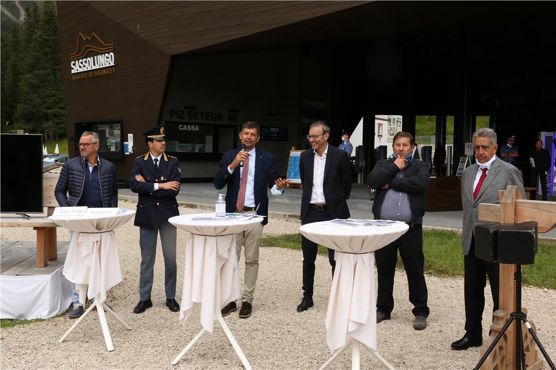 Der Ausbau der öffentlichen Verkehrsmittel, ein umfassendes Verkehrsmonitoring auf den Dolomitenpässen und eine gemeinsame strategische Planung sind die Prioritäten des Landesressorts für Infrastrukturen und Mobilität bei der Ausarbeitung der Lösungsansätze für eine sanfte Erschließung der Dolomitenpässe. Mobilitätslandesrat Daniel Alfreider hat zusammen mit seinem Trentiner Amtskollegen Roberto Failoni und dem Vizebürgermeister Ivo Insam (Wolkenstein) und Bürgermeister Leandro Grones (Fodom) die gemeinsame Herangehensweise am heutigen Donnerstag (16. Juli) bei einer Pressekonferenz in Plan de Gralba vorgestellt. "Ziel sind ein Gesamtkonzept und dessen Umsetzung Schritt für Schritt. Im Jahr 2020 werden aufgrund der Ausnahmesituation erste Schritte der Verkehrsberuhigung und -verlagerung gesetzt. Basis für alle Entscheidungen und Maßnahmen ist ein Monitoring mit Zahlen, Daten und Fakten sowie Expertisen von Fachleuten", erklärte Mobilitätslandesrat Alfreider.