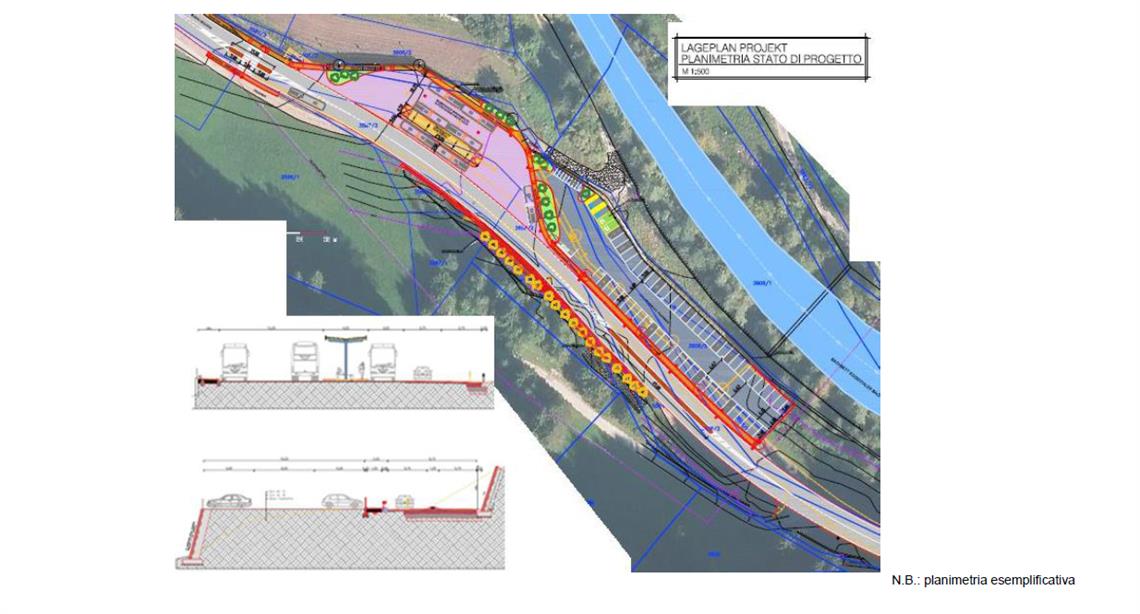 Im Zuge der Erweiterung des Areals des Busbahnhofes wird auch ein Fahrbahnteiler errichtet, um Überholmanöver in der Nähe des Bahnhofes zu unterbinden. Mit dem Ausbau des Parkplatzes werden in Zukunft 62 Auto-Stellplätze zur Verfügung stehen, wobei zwei Parkplätze für Menschen mit Behinderung und zwei für Elektrofahrzeuge reserviert sind. Hinzu kommen zehn Stellplätze für Motorräder. In das Bauvorhaben wird das Land rund 930.000 Euro investieren.
