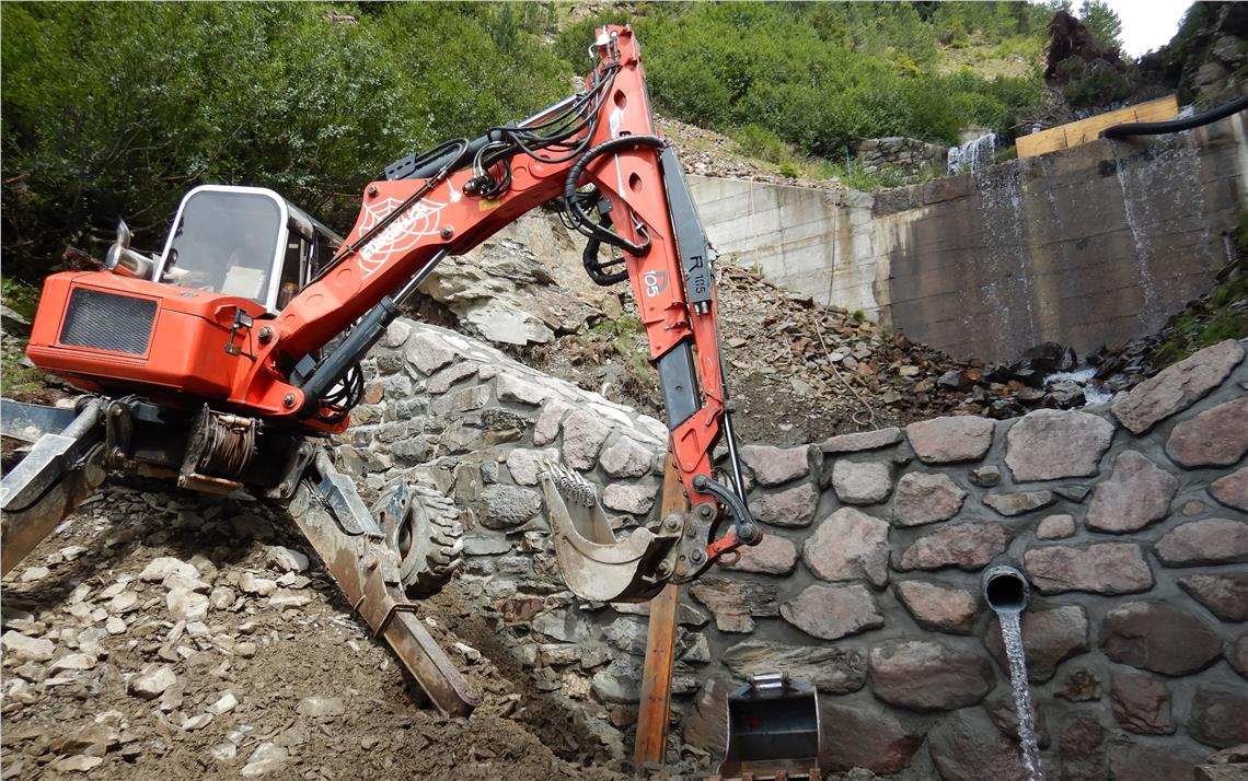 In diesem Sommer hat das Landesamt für Wildbach- und Lawinenverbauung Nord in der Agentur für Bevölkerungsschutz nun die verbliebenen 65 Jahre alten Sperren saniert, berichtet Projektant und Bauleiter Philipp Walder: Fünf der alten Sperren wurden ab Juni in Handarbeit und mit einem Schreitbagger saniert. Zuerst wurde der Bewuchs entfernt, danach mit einem Hochdruckreiniger alte Fugen gereinigt und neu verfugt. Teile, die bereits zusammengebrochen waren, hat der Bautrupp mit Vorarbeiter Alex Messner instandgesetzt und wieder neu errichtet. Da das Gelände sehr unwegsam ist, musste ein Großteil des Materials mit einem Hubschrauber transportiert werden.