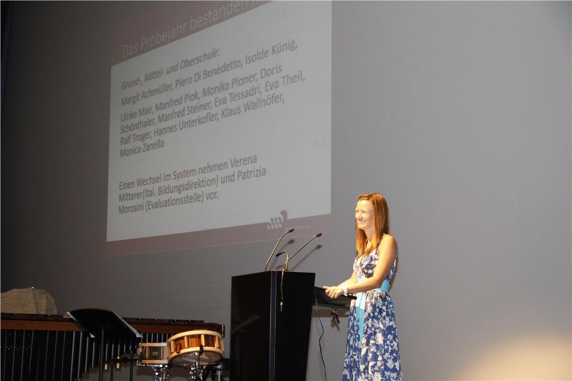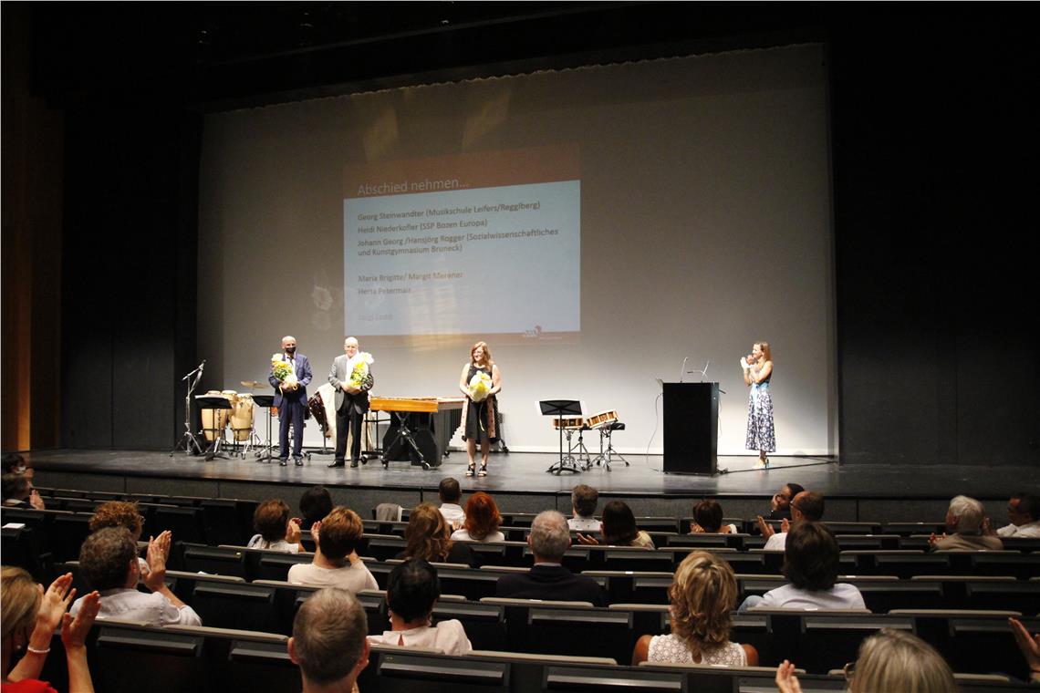 Im Rahmen der Veranstaltung, die von der Deutschen Bildungsdirektion organisiert wurde, verabschiedeten Landesschuldirektorin Falkensteiner und Bildungsdirektor Tschenett jene Schuldirektorinnen und -direktoren, die ab September in den Ruhestand treten. Zudem begrüßten sie die neuen Schulführungskräfte, die in diesem besonders herausfordernden Jahr ihren Dienst antreten. Die Formation "GigaPercussion", ein Percussion-Ensemble der Musikschulen Unterer Vinschgau und Lana/Ulten/Nonsberg sorgte bei dieser Eröffnungskonferenz für schwungvoll-rhythmische Unterhaltung.