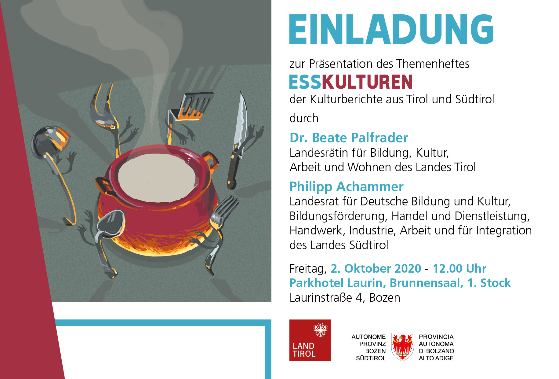 Der Esskultur ist das druckfrische Tiroler und Südtiroler Kulturberichte-Themenheft gewidmet, das Südtirols Kulturlandesrat gemeinsam mit seiner Tiroler Amtskollegin heute vorgestellt hat.