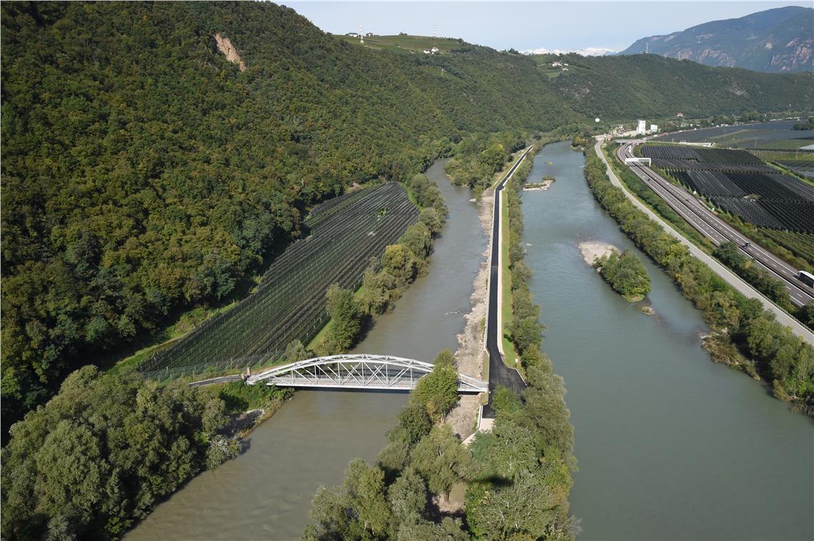 Das Amt für Wildbach- und Lawinenverbauung Süd hat die Arbeiten am Böschungsdamm im Fischerspitz am Zusammenfluss von Etsch und Eisack abgeschlossen, der Radweg wird für dieses Wochenende geöffnet.