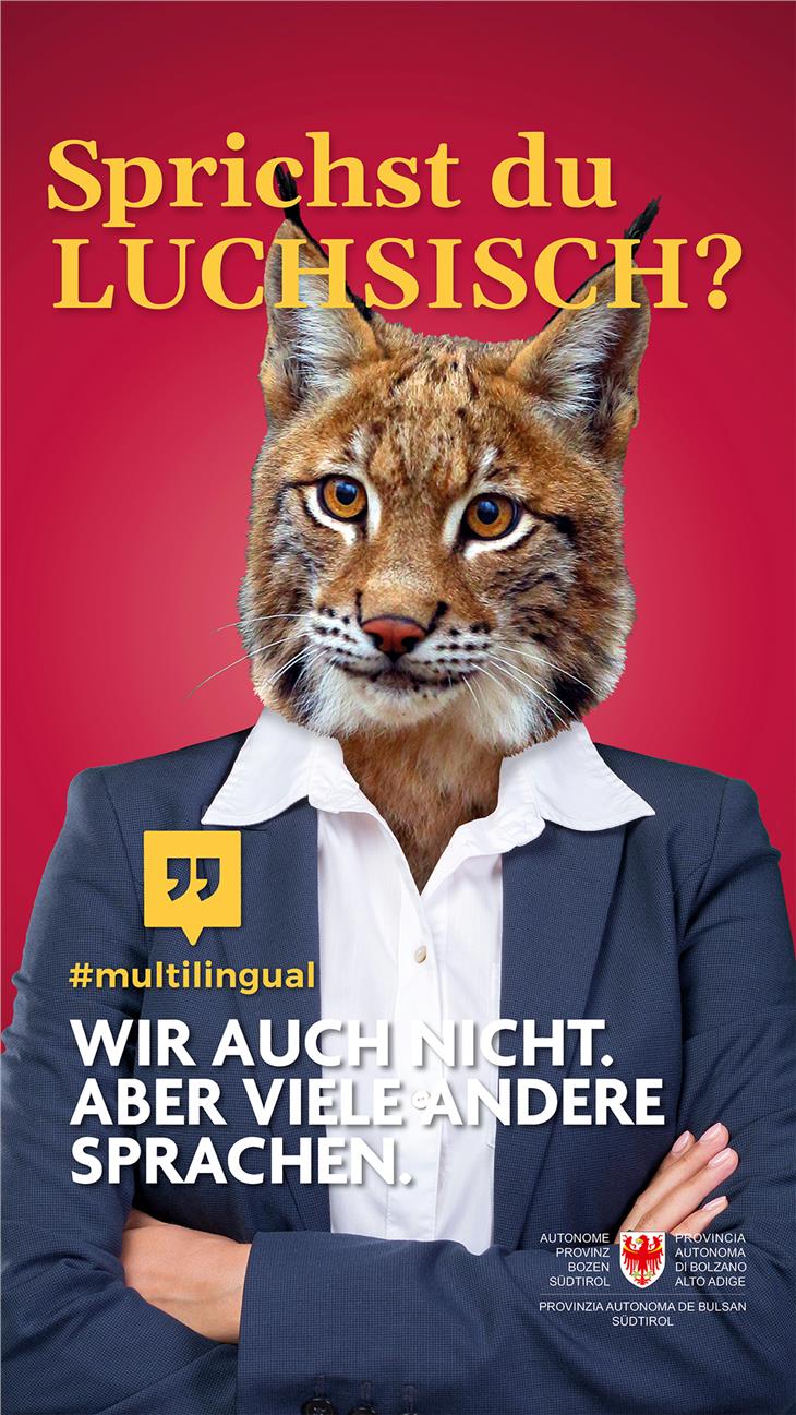 Sprichst du LUCHSISCH? Parli ZEBRESE? Baieste CAMALEONESC? Mit diesen Fragen, die sich auf einer Plakatserie wiederfinden, soll die öffentliche Aufmerksamkeit humorvoll auf das Thema der Mehrsprachigkeit gelenkt werden. Insgesamt fünf Plakatversionen liefern auch schon die Antwort: "Wir auch nicht. Aber viele andere Sprachen." Und verweisen mit der Betonung "Nie wieder sprachlos!" auf die Webseiten des Landes zum Thema Sprachen (www.provinz.bz.it/sprachen). Plakatiert wird an Südtirols Bahnhöfen und Bushaltestellen.