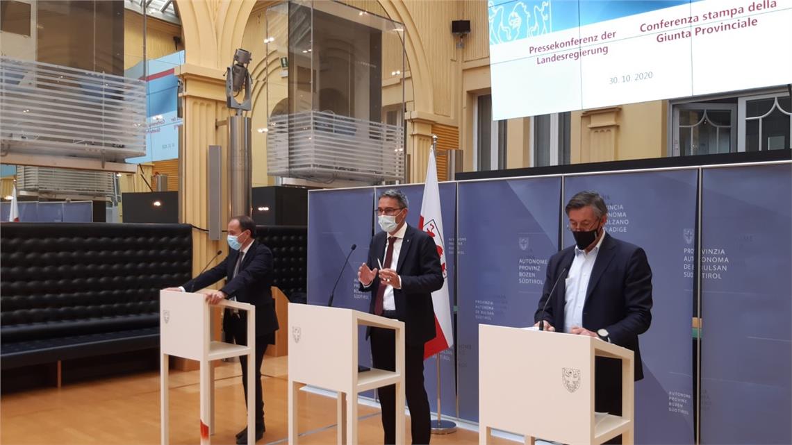In Südtirol gibt es aktuell eine Zunahme der Infektionen mit dem Coronavirus. Die Daten, Einschätzungen und Erfahrungsberichte des Südtiroler Sanitätsbetriebes und die Daten aus der experimentellen Covid-Überwachung von Südtirols Abwässern weisen deutlich darauf hin. Ab morgigem (31. Oktober) Samstag sollen deshalb strengere Maßnahmen zum Schutz vor dem Coronavirus gelten. Landeshauptmann Arno Kompatscher, Gesundheitslandesrat Thomas Widmann und Umweltlandesrat Giuliano Vettorato haben die wichtigsten Daten und Maßnahmen heute (30. Oktober) in Bozen im Detail vorgestellt.