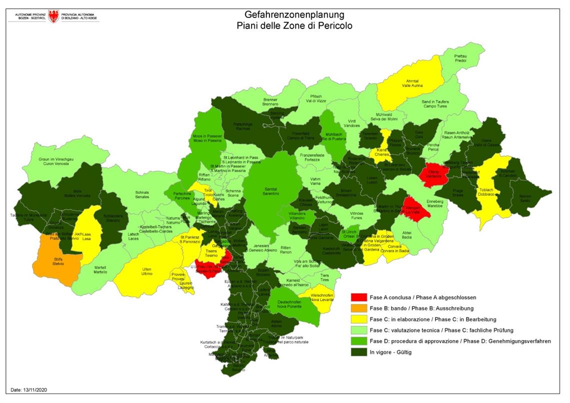 Seit 2007 haben 57 Südtiroler Gemeinden einen aktuellen Gefahrenzonenplan (GZP): Statistisch ausgedrückt sind das 49 Prozent der Gemeinden, jedoch 69 Prozent der Südtiroler Bevölkerung. Im Landesgesetz Raum und Landschaft wurde die ursprüngliche Gesetzesregelung von 2007 übernommen und die Frist aktualisiert: Die Gemeinden müssen bis zwei Jahre nach in Krafttreten des Gesetzes Raum und Landschaft ihren GZP genehmigt haben. Das Gesetz ist mit 1. Juli 2020 in Kraft getreten.