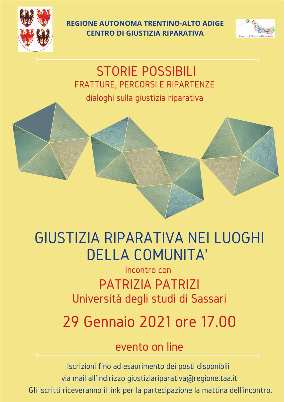 stattfindet, wird die Psychologin Patrizia Patrizi über die "Wiedergutmachungsjustiz in Gemeinschaftsorten" referieren. Patrizi lehrt an der Universität Sassari Rechtspsychologie und Praktiken der Wiedergutmachungspolitik, ist Präsidentin von PsicoIus (Scuola romana di psicologia giuridica) und ist Mitglied des Rates des "European Forum for Restorative Justice".