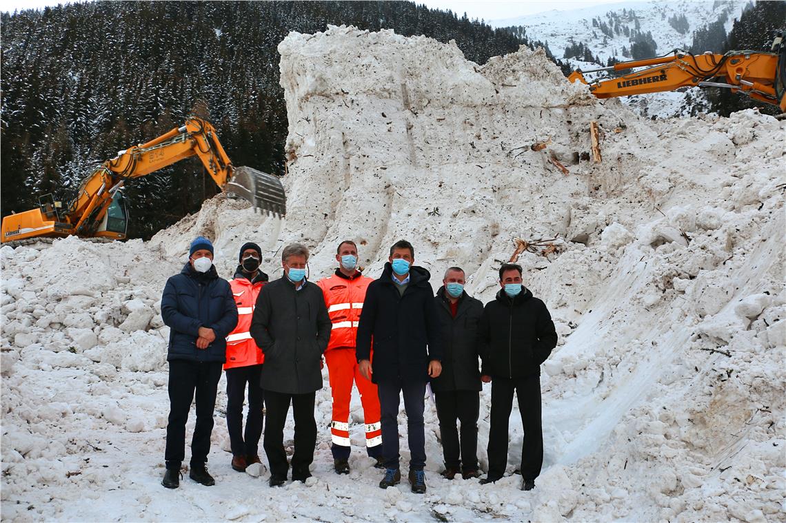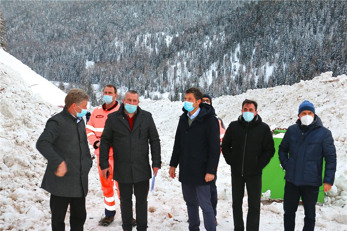 Vom lawinengefährdeten Straßenteil in Weissenbach hat sich LR Alfreider mit Gemeindevertretern und Technikern ein Bild gemacht. Schon im Herbst soll der Bau einer Schutzgalerie ausgeschrieben werden.