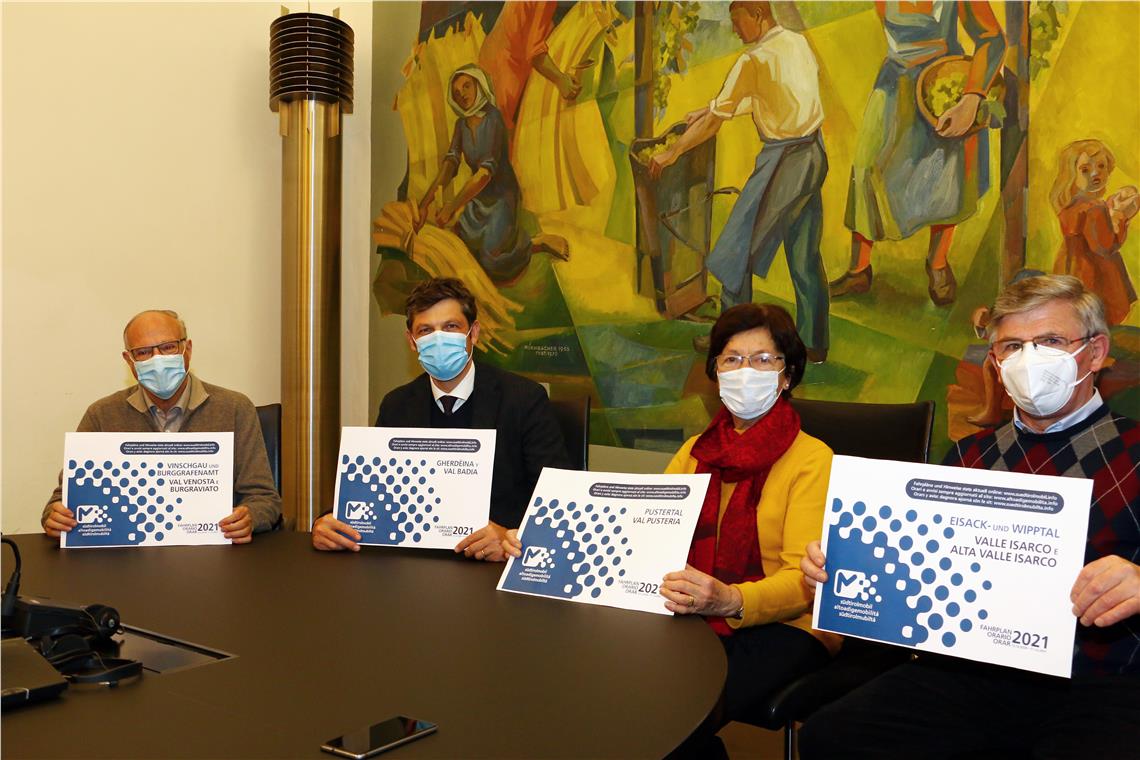Zusätzlich werden die gedruckten Fahrpläne in Zusammenarbeit mit den Organisationen des Katholischen Verbands der Werktätigen (KVW) und der Seniorenvereinigung im Südtiroler Bauernbund verteilt. Diese neue Zusammenarbeit wurde vor einem Monat bei einem Treffen zwischen Landesrat Alfreider, dem Präsidenten des Seniorenbundes Otto von Dellemann, Josef Weissteiner als Vertreter der Seniorenvereinigung im Bauernbund und Maria Kusstatscher als Vertreterin des KVW beschlossen.