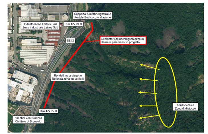 Die Arbeiten in der Gemeinde Leifers hingegen sollen das Steinschlagrisiko auf der Brennerstaatsstraße (SS12) östlich der Industriezone Leifers Süd verringern. "Auf unserer Prioritätenliste zum Steinschlagschutz steht das Vorhaben auf der vielbefahrenen Straße ganz weit vorne, da es 2016 zu einem Steinschlag im Bereich des Rondells in der Industriezone gekommen war, bei dem ein etwa vier Kubikmeter großer Block den bestehenden Schutzzaun durchbrochen hat und erst knapp bergseitig der Straßenstützmauer zum Stillstand gelangt war", erklärt Mobilitätslandesrat Alfreider.