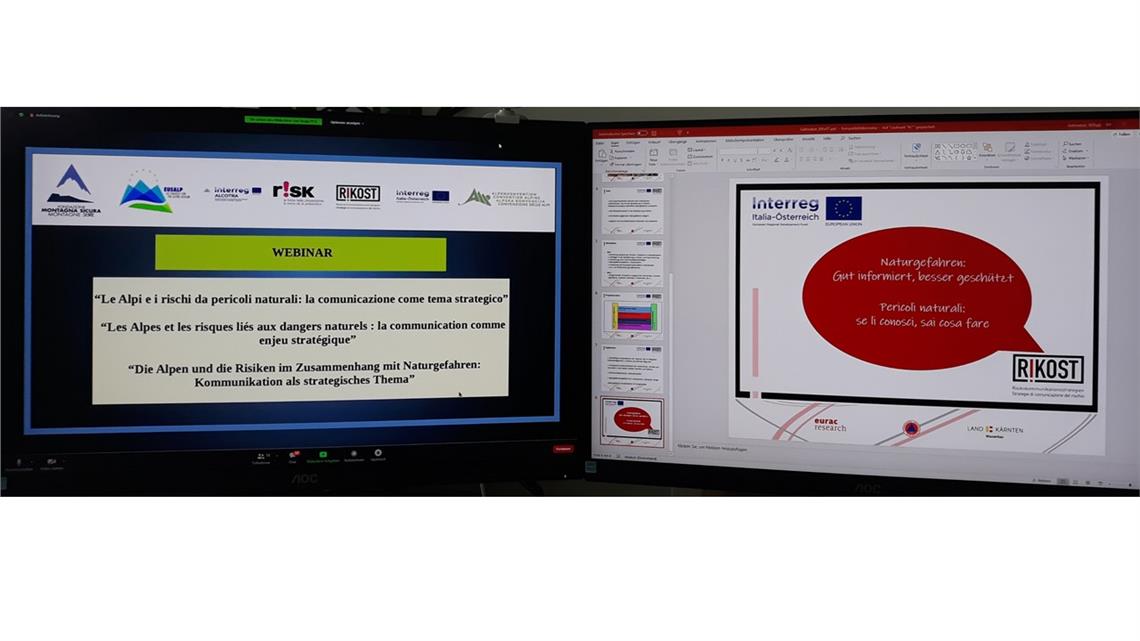 Bei einem Webinar mit rund 150 Teilnehmenden wurden nun Informationen und Erfahrungen zwischen den beiden Projektbeteiligten ausgetauscht und Erkenntnisse aus den Projekten weitergegeben. Unterstützt wurde das Webinar von der Plattform Naturgefahren der Alpenkonvention und der Action Group 8 Risk-Governance der EUSALP. Vertreter der beiden Projekte präsentierten die allgemeinen Ziele und Aktivitäten der jeweiligen Projekte: eine über Umfragen erhobene Risikowahrnehmung in der Bevölkerung, Aktivitäten der Risikokommunikation mit Jugendlichen, partizipative Aktionen auf Gemeindeebene, Informationen über Internet und soziale Medien sowie Aus- und Weiterbildung verschiedener Zielgruppen zur Risikokommunikation.