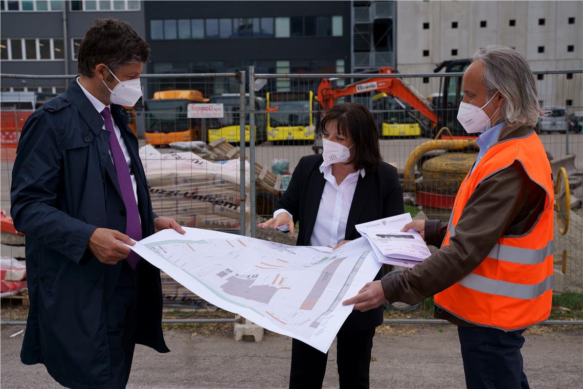 Am Betriebshof von SASA in Bozen haben kürzlich die Arbeiten an der neuen Wasserstofftankstelle für Busse begonnen. LR Alfreider und SASA-Direktorin Piffer waren auf der Baustelle.