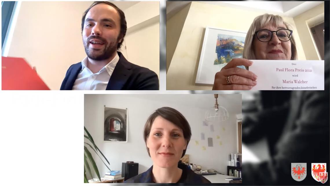 Die Landesräte für Kultur der Länder Südtirol, Philipp Achammer, und Tirol, Beate Palfrader, zeichneten heute (15. Mai) die Südtiroler Künstlerin Maria Walcher mit dem Paul-Flora-Preis 2021 aus. Die Preisvergabe fand anlässlich des zwölften Todestages von Paul Flora im Rahmen einer virtuellen Feier, die über den Youtube-Kanal des Landes Südtirol übertragen wurde, statt.