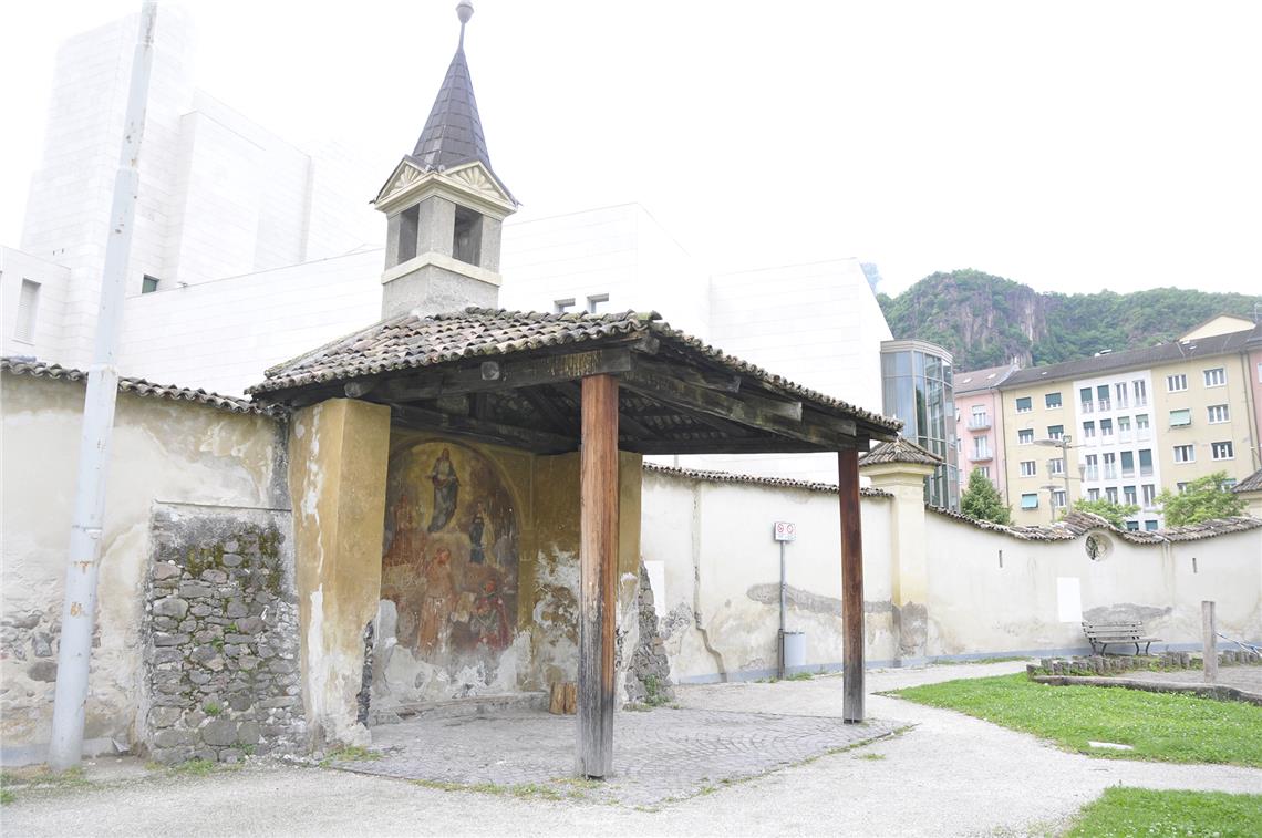 Die Wandmalerei des Kappellenbildstocks im Kapuzinergarten in Bozen soll keinen weiteren Schaden nehmen. Daher hat das Land umgehende Schutzmaßnahmen getroffen.