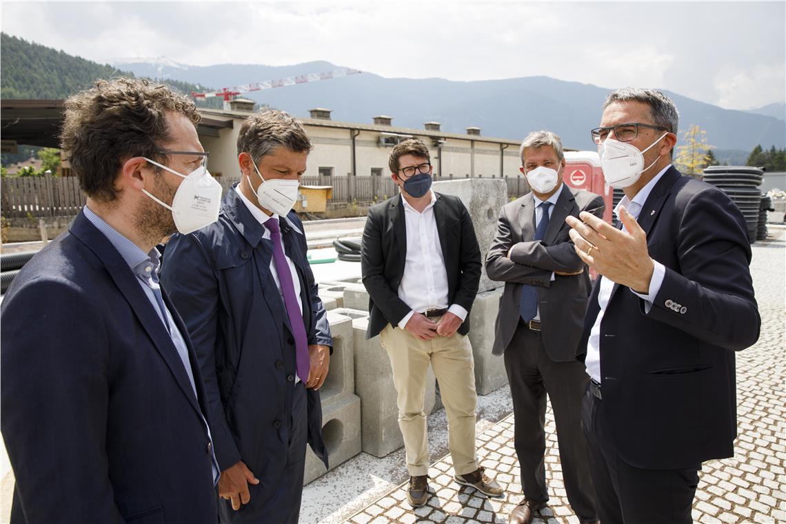 Ein großes Vorhaben für die Verbesserung des Verkehrs auf der Hauptachse ist die neue Einfahrt ins Gadertal in St. Lorenzen, wo sich Landeshauptmann Arno Kompatscher, Mobilitätslandesrat Daniel Alfreider und die Bürgermeister Martin Ausserdorfer (St. Lorenzen), Giorgio Costabiei (St. Martin in Thurn), Angel Miribung (Wengen), Iaco Frenademetz (Abtei) und Felix Ploner (Enneberg) heute (4. Juni) vor Ort den Baufortschritt angeschaut haben. Auch in Bruneck, wo das neue Mobilitätszentrum, das verschiedenen Mobilitätsformen verknüpft, entsteht, haben sich Kompatscher und Alfreider gemeinsam mit Bürgermeister Roland Griessmair, STA-Direktor Joachim Dejaco und STA-Präsident Martin Ausserdorfer ein Bild von den bisherigen Arbeiten gemacht.
