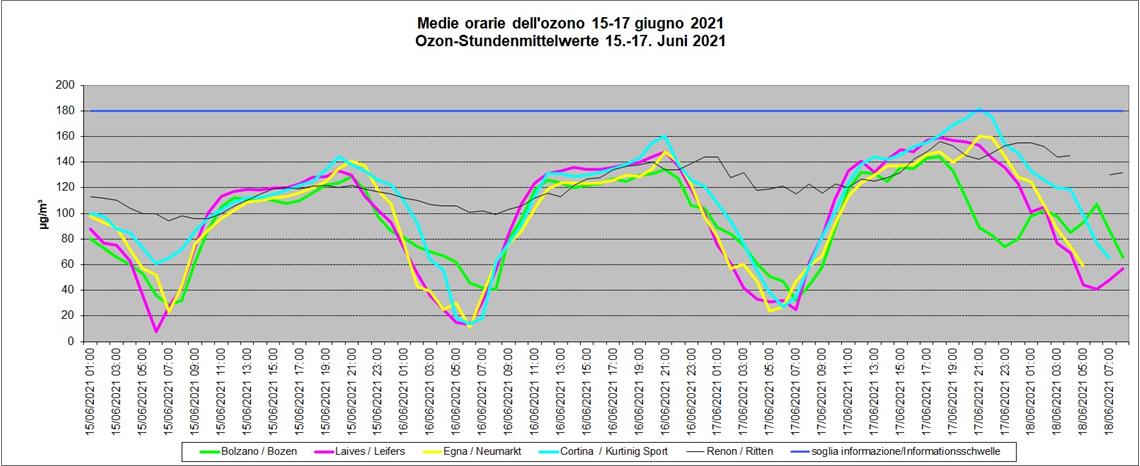 Die Informationsschwelle liegt, was die Ozonkonzentration betrifft, bei 180 Mikrogramm Ozon pro Kubikmeter Luft. Am gestrigen Donnerstag, 17. Juni, wurde diese Schwelle in Kurtinig an der Weinstraße um 22 Uhr (höchster Stundenmittelwert 182 µg/m³) überschritten, wo sich am Sportplatz die Messstation des Landeslabors für Luftanalysen und Strahlenschutz befindet.