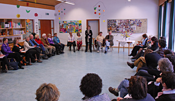 Feter trënta educadëures de scolines, espertes y esperc dl ciamp dla pedagogia infantila à fat l viac da de plu raions dl Deutschland y dal Elsass-Lothringen tla Franzia per mparé a cunëscer de prima persona co che l vën laurà tla scolines ladines n cont dla rujenedes. L nseniamënt de plu rujenedes te un n iede te na forma naturela de plurilinguism à descedà gran marueia y nteres da pert di vijitadëures. Tla scolines ne vëniel nia fat n nseniamënt de rujeneda tlassich, no cun nsenianc de rujeneda, no cun educadëures sëuraprò. Da cater ani vëniel laurà do n cunzet per ti nsenië ai mëndri dla scolina a desferenzië la rujenedes. La rujenedes ne vën nia adurvedes per cajo ma do n sistem che lieia n culëur a uni rujeneda. Vërt per l ladin, cueciun per l tudësc y ghiel per l talian. Do chësc sistem à la educadësses pedagogiches dla scolines ladines nstës svilupà y metù adum juesc, cianties y stories. “Chësc liam dla rujeneda cun l culëur juda ai mëndri a se rënder cont canche l vën rujenà ladin, can tudësch y can talian” à spiegà la diretëura dla scolines Edith Ploner. Esperc dl ciamp rejona de metodologies comparatives y contrastives te chël che l nseniamënt se basa scialdi sun chël che i pitli vëij per pudëi pona fé n culegamënt cun la rujeneda. La delegazion cumpanieda dal cunesciù prufessëur Otto Filzinger, espert de educazion interculturela tl’Università a Persenon, se stima dassënn co che la rujenedes vën purtedes daujin ai mëndri una dlongia l’autra. “La ne se trata nia de spartì la rujenedes - miec la cultures, ma de fé orden” à dit la vizediretëura Hannelore Insam.