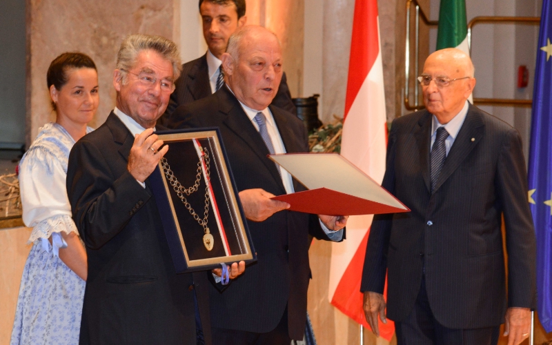 USP – I presidënc dla Talia y dl’Austria Giorgio Napolitano y Heinz Fischer à pià do l gran orden de merit dla Provinzia de Bulsan. Cun la sëurandata (NCUEI) ai 05 de setëmber a Maran à l Südtirol demustrà recunescënza al’Austria y al Stat Talian per avëi lascià prò l’Autonomia al Südtirol.