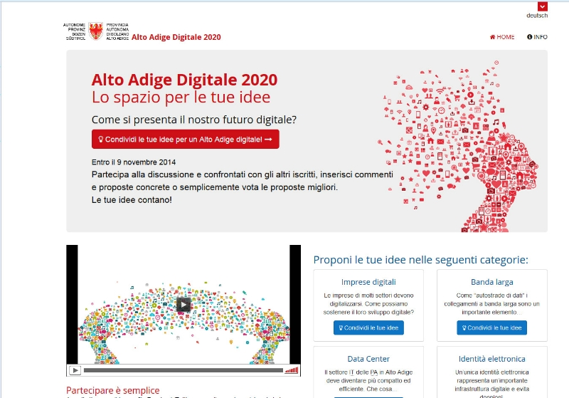 Inće tl Südtirol él le prozes de digitalisaziun di sorvisc pità dal’Aministraziun publica che va inant. „Por ti dè l’oportunité a plü zitadins poscibl da colaborè por l’orientamënt nü dla digitalisaziun tl Südtirol ùnse svilupé n plann cun na plataforma internet olache les propostes de nüsc esperć vëgn presentades y olache les porsones che anüza i sorvisc po fà sü comentars por miorè la comunicaziun online tres la tecnologia informatica“ à dit incö l’assessuria por l’informatica Waltraud Deeg che à ajunté che le fin dl prozès é la scemplificaziun di sorvisc por i zitadins y les dites tres la digitalisaziun dles prozedöres.