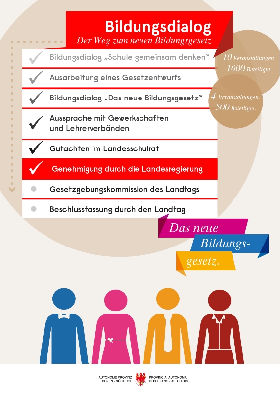 La presentaziun dl dëssegn de lege sön l’istruziun da pert di trëi assessurs por la scora incö a Balsan é n vare important tla direziun de na regolamentaziun nöia tl setur dl’istruziun. La Junta provinziala â aprovè n mertesc la proposta de lege portada dant dai assessur Achammer, Mussner y Tommasini y che gnarà menada inant insciö al Consëi provinzial.