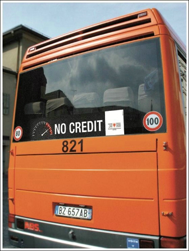 Sön 80 corieres che vëgn adorades tl trasport publich local él gnü taché sö sön la pert iadedô n placat cun le motif nü dla campagna de sensibilisaziun cuntra i inzidënc di motors sön strada „No Credit“. Chësta é öna dles mosöres preodüdes tl 2015 por sensibilisé i zitadins da rovëne te na manira sigüda y responsabla.