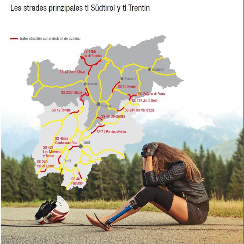 La verjiun ladina é gnüda traslatada tl idiom dla Val Badia y sön le flyer él da ciafé les informaziuns plü importantes sön les trasses plü prigoroses por i motoziclisć tl Südtirol y tl Trentin. Por le pröm iade ne él nia da odëi na fotomontaja, mo na testimonial reala cun na storia da cunté fora dla vita. Le placat nü mostra Doris, che á albü cun 17 agn n inzidënt cun le motor pro chël che ara á pordü na iama. „Por le pröm iade él insciö na porsona che mostra na fotografia sensibla che nes visualisëia les conseguënzes tragiches de secunc de dejatenziun cun situaziuns che pó cambié döt le percurs dla vita“, á splighé l’assessur por les strades y la mobilité Florian Mussner.